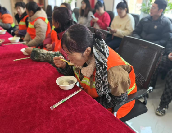 吃元宵、话家常。乐园社区邀请辖区环卫工人齐聚一堂,气氛热烈而温馨。社区工作人员把精心准备好的元宵逐一送到环卫工人手中,向环卫工人提前致以节日的问候,感谢他们为城市环境所付出的辛勤努力。这些坚守在城市一线的奉献者,为提升城市形象、改善人居环境作出了重要贡献,他们的工作不仅是清洁,更是对生活环境质量的呵护。