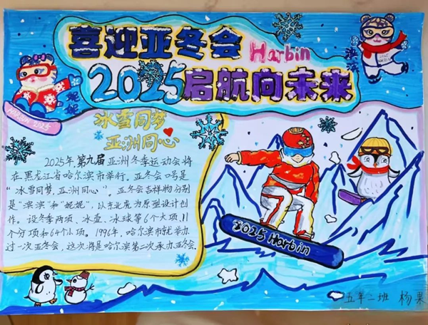 学生们以亚冬会为主题,制作了一系列精美的绘画手抄报。在这些手抄报中,学生们用五彩的画笔描绘了花样滑冰、短道速滑等比赛项目,以及他们对运动员们精彩表现的赞美。这些作品不仅展示了学生们的艺术天赋,也传递了他们对冰雪运动的热情和对亚冬会的美好祝愿。