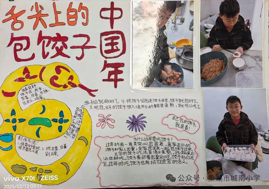 小小厨房,各显神通。同学们参与年夜饭的烹制,包饺子、红烧排骨……同学们在家长的帮助下亲手完成一道道年夜佳肴,打造属于自家的浓浓“年味”,并将自己所学所获记录在手抄报上,定格幸福瞬间。