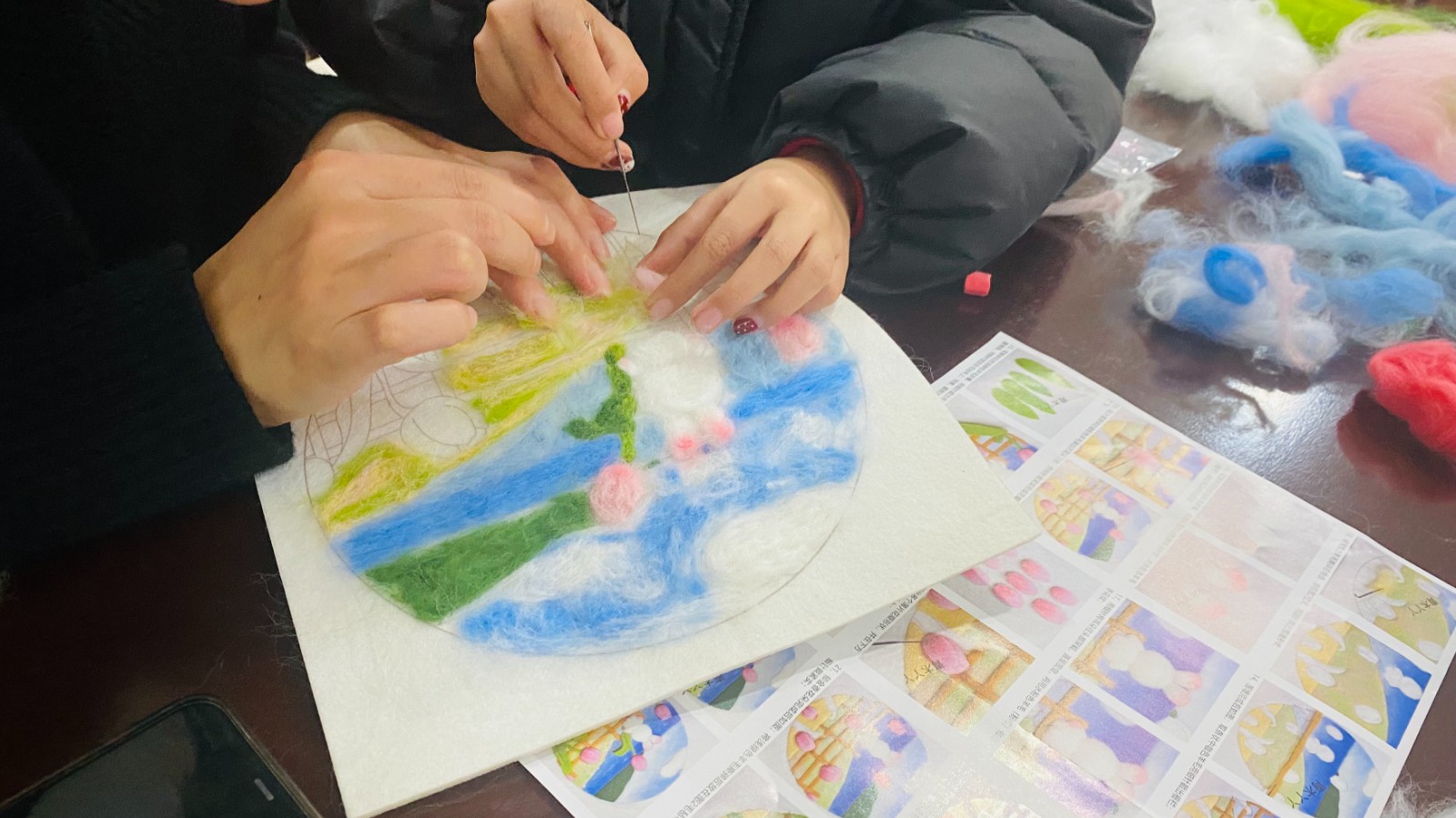 羊毛毡虽做法简单,却非常考验制作者的耐心与细致。在老师的指导下,大家使用专用戳针一针一针地戳刺,小小的戳针在灵巧的手中舞动,嫩绿的草芽、粉色的花瓣、金黄的迎春花,这些春天的元素在羊毛毡的世界里跃然成型,带来满满的春意与活力。“原来羊毛毡这么好玩!刚开始我还担心会戳到手,但学着学着就觉得好简单,看着自己手里的羊毛毡变成一朵朵小花,感觉好有趣!”参加活动的小朋友表示。