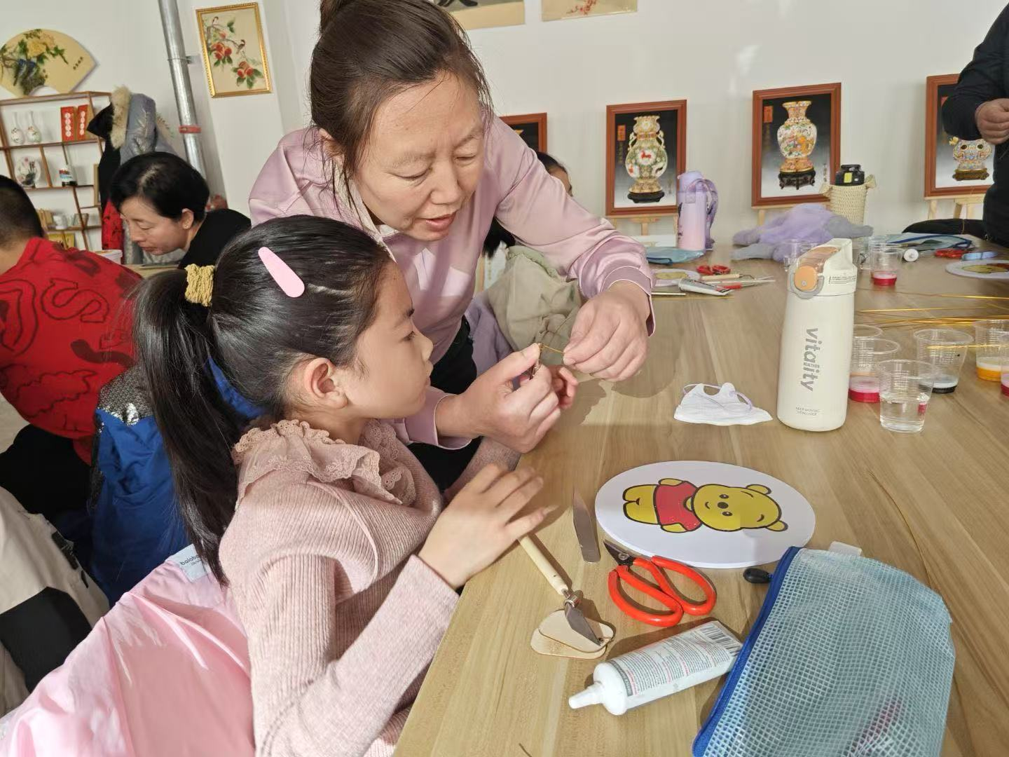 在老师的指导下,孩子们拿起镊子,将细细的铜丝依照设计好的图案轮廓,仔细地弯折、粘贴在特制的底板上。这一过程十分考验耐心与细心,稍有不慎铜丝就会变形,但孩子们没有丝毫退缩,相互交流、互相帮助。点蓝环节同样充满挑战,孩子们手持工具,将色彩各异的釉料填充进铜丝勾勒的图案内,精心调配色彩,力求呈现出最完美的效果。