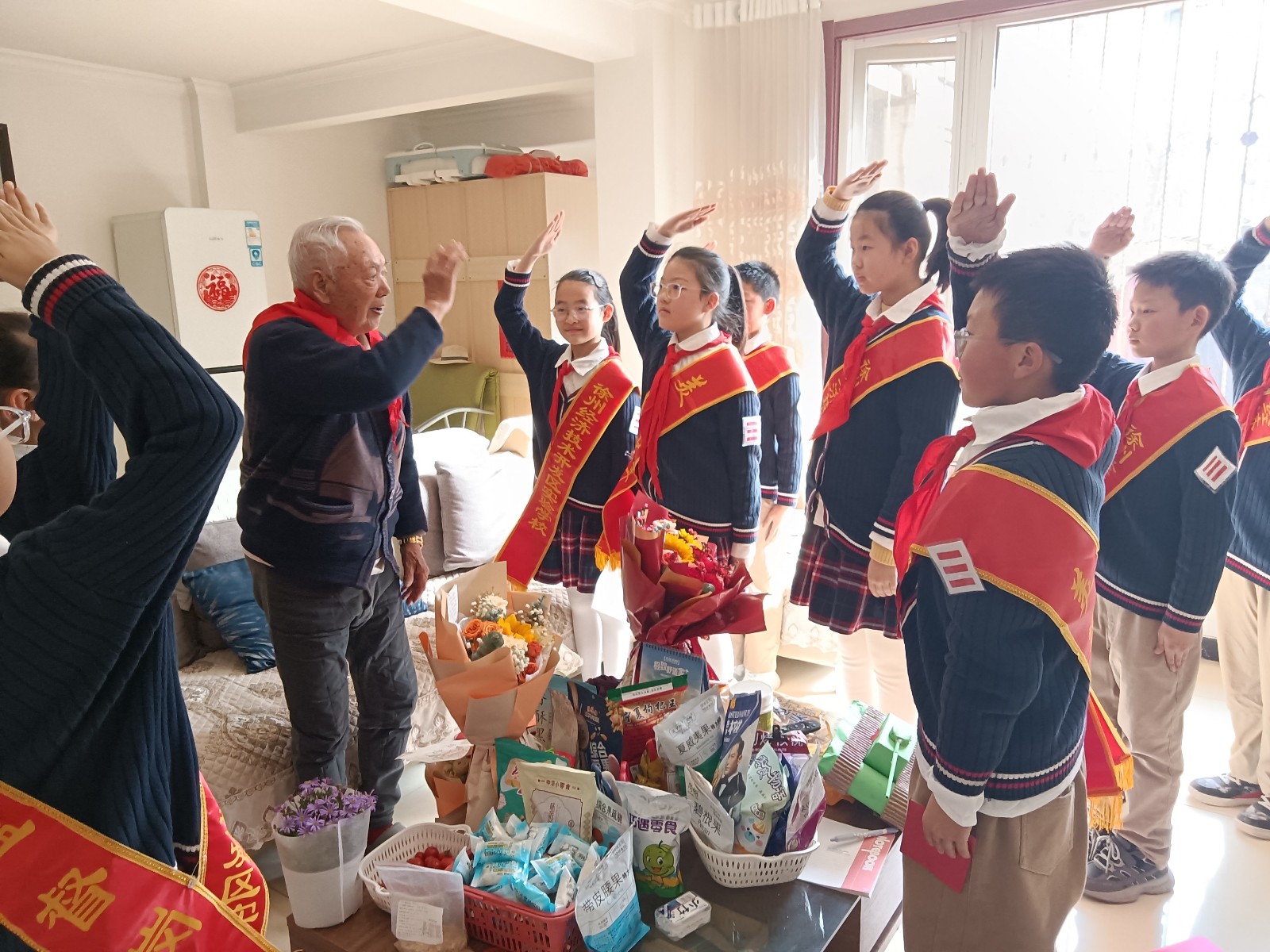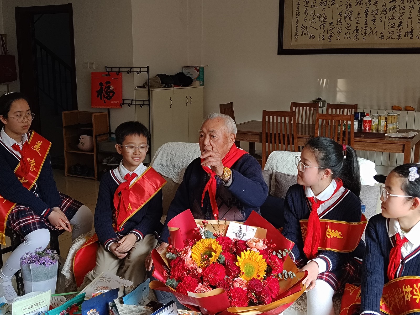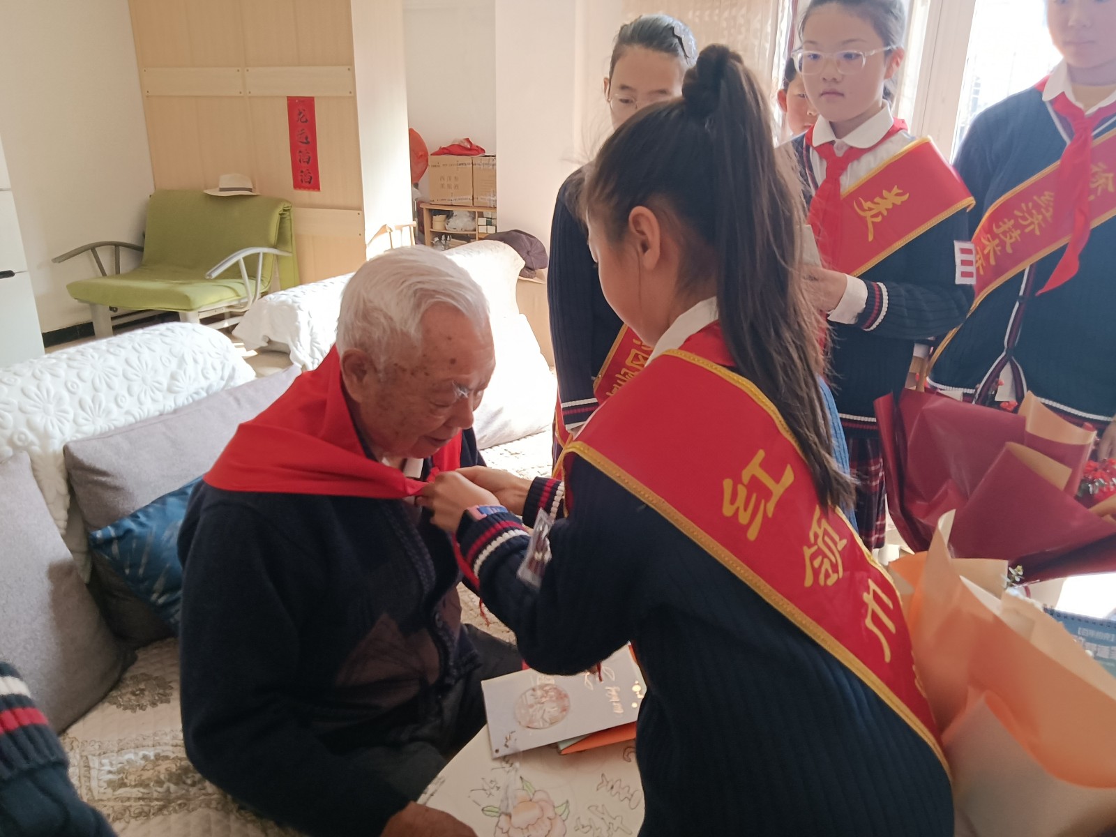 3月1日上午,来自实验小学的小志愿者们深入社区,带上鲜花和手工制作的礼物上门走访慰问抗美援朝老革命军人——吴有义爷爷,学习他的先进事迹和高尚品德。到了吴爷爷家,少新队员先上前为吴爷爷戴上红领巾,并集体向吴爷爷敬少先队员队礼,表达对吴爷爷的尊敬。