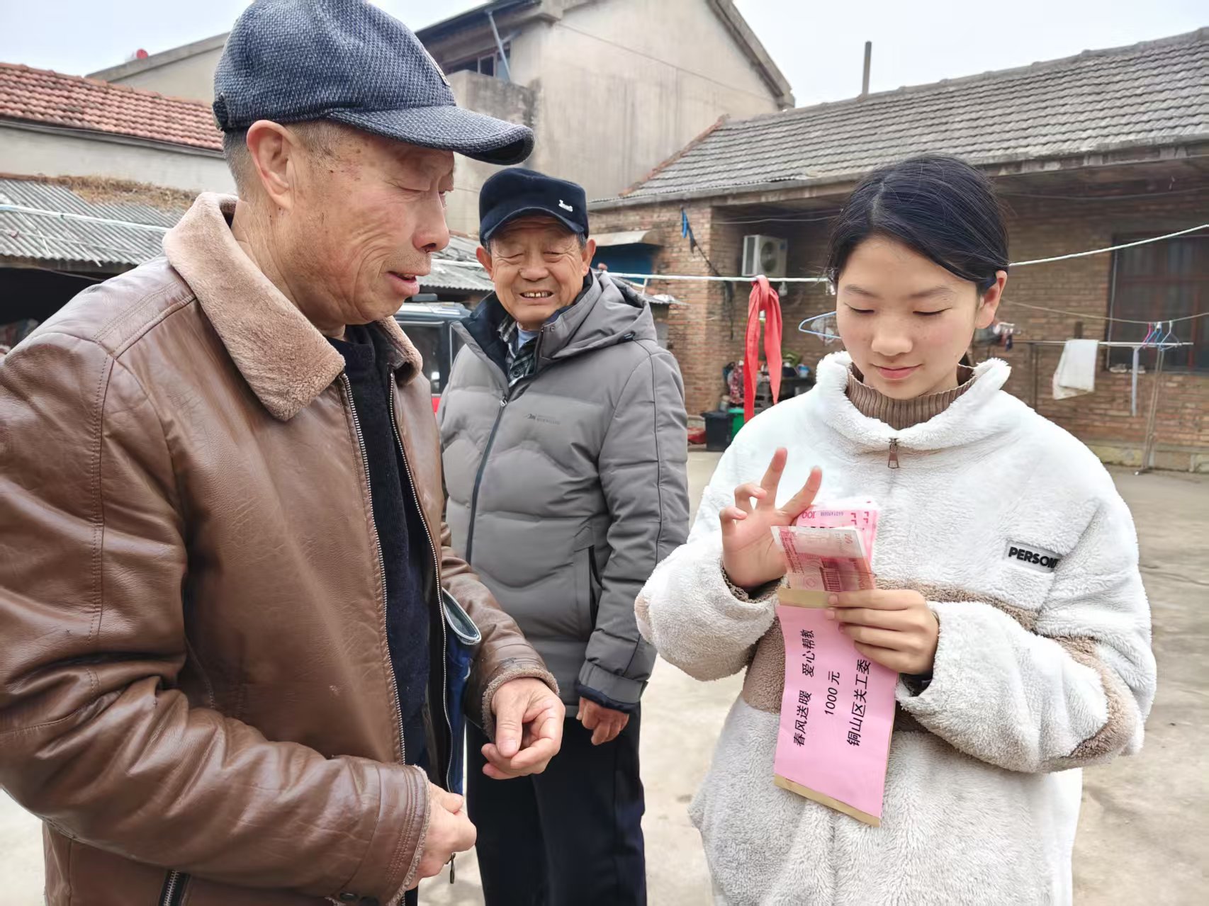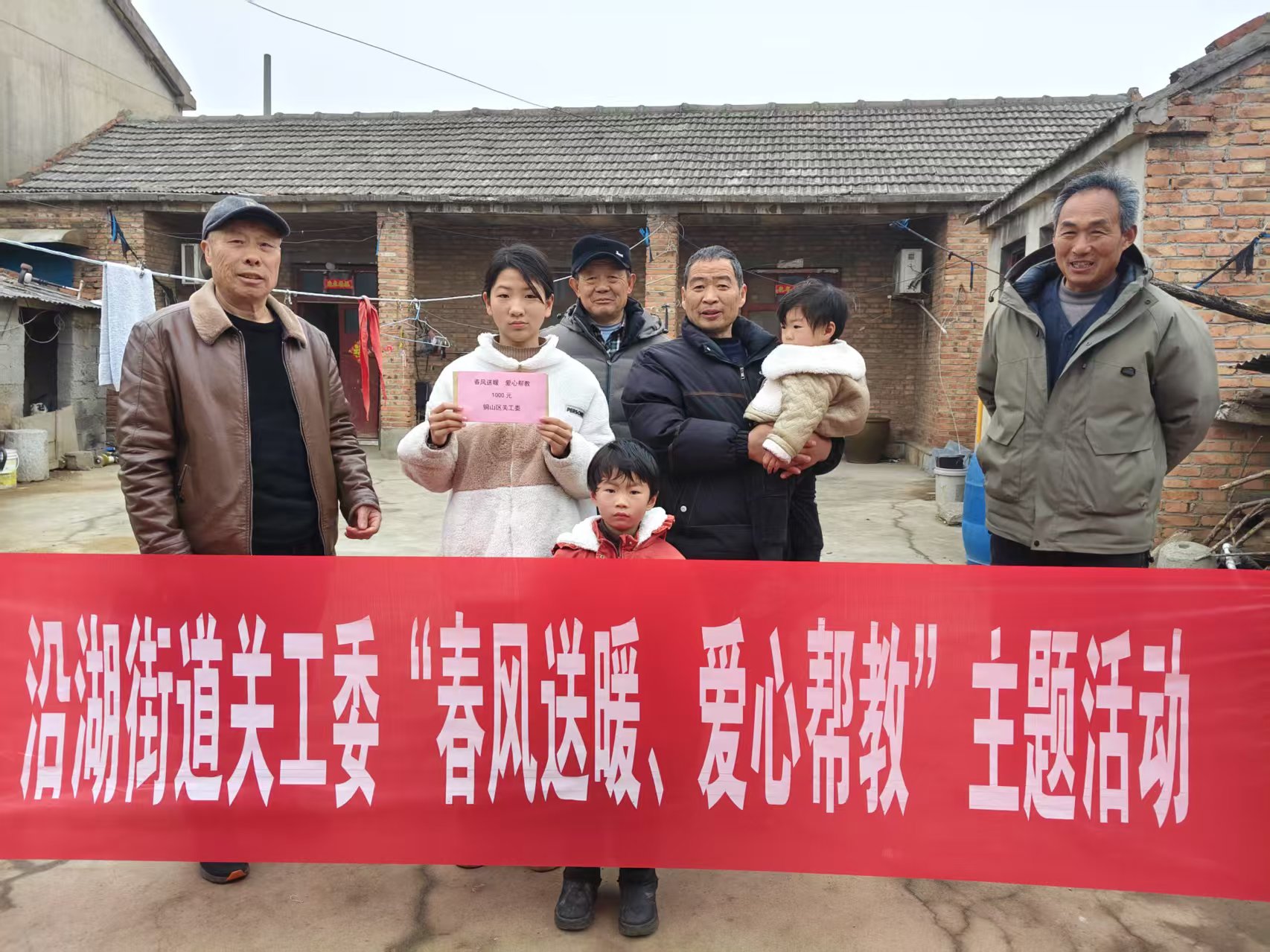 3月1日上午,江苏省徐州 市铜山区沿湖街道关工委副主任杜玉银和丁继军按照区关工委的文件精神到沿湖街道二分场姚楼村开展“春风送暖、爱心帮教”捐助活动,为“五失青少年”每人送去一千元人民币。