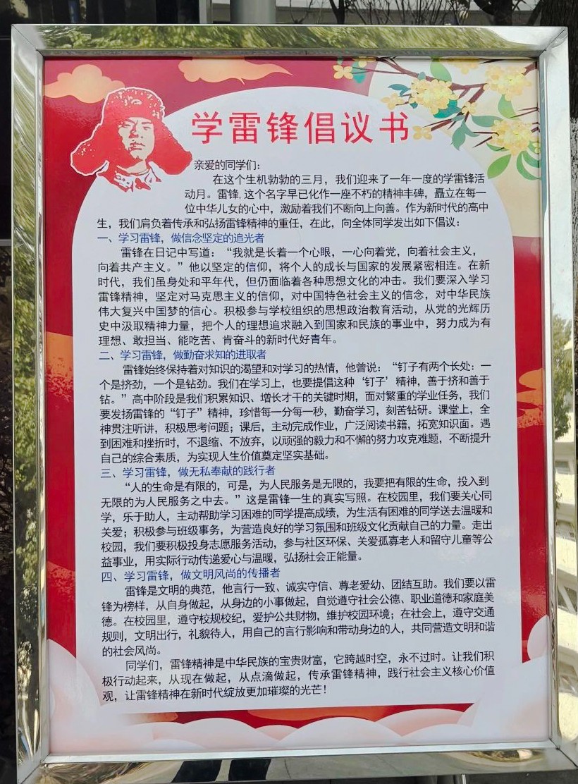 行动宣言。为将雷锋精神具象化、行动化,学校特别策划学雷锋倡议书,通过视觉化、互动化的形式,让倡议“看得见、摸得着、做得到”,号召全体师生从身边小事做起,让善意在校园内外生根发芽。