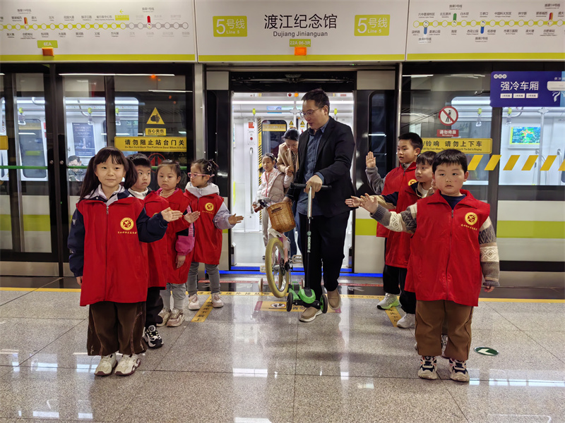 活动中,小小志愿者们在工作人员的指引下,穿上志愿服务的红色马甲,来到渡江纪念馆站的红色驿站学习参观,学习了如何帮助乘客在自动售票机购票,微型消防站的设备以及消防栓、灭火器的使用方法,接着在站长的带领下进入值班总控室进行观摩学习。经过工作人员耐心讲解一系列的“岗前”培训,小志愿者们了解到地铁是怎么运行的。在熟悉工作流程以后,志愿者们精神昂扬的踏上了志愿服务之旅。在地铁站的各个角落,志愿者们通过为乘客提供文明引导,爱心帮扶等志愿服务,提升了自身的实践能力和解决问题能力,在帮助他人的过程中,不仅传递了温暖和关爱,也让他们体会到奉献的快乐,在实践中得到了锻炼和成长。