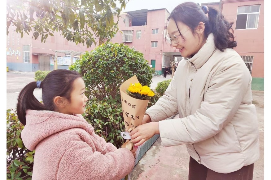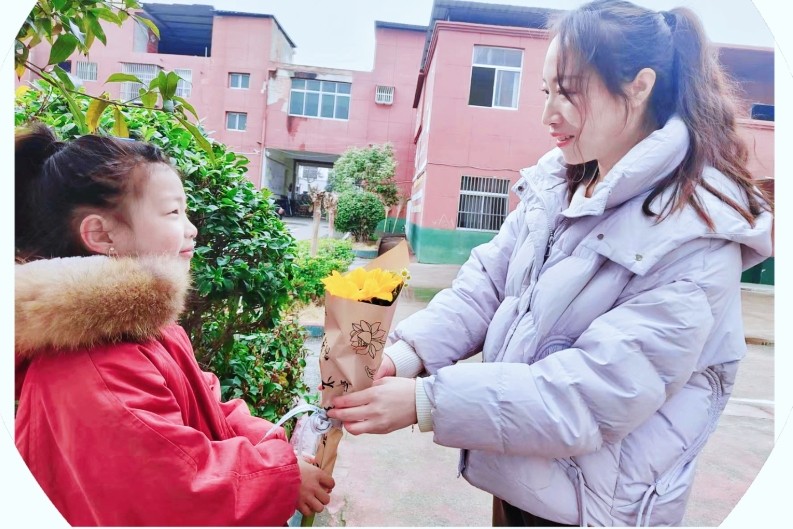 亲爱的老师!“三八”节快乐!您们辛苦了!这是我做的小花献给您!学生们一朵朵小花,一张张祝福卡、一句句问侯,送到老师面前。老师们幸福的笑容在脸上绽放,学生们用不同的方式表达对老师祝福和敬意。