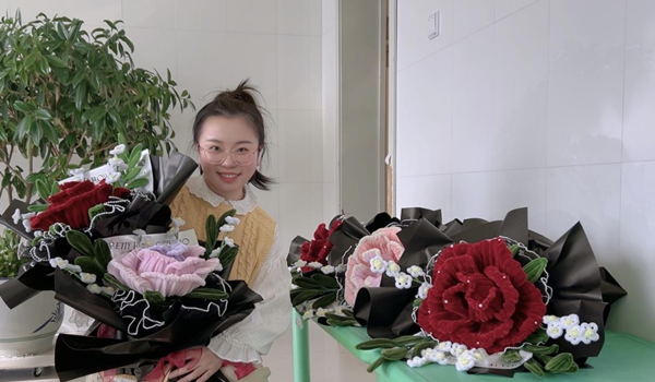 花束制作完成后,就是包装啦!包装也不是件容易的事情,首先要将包装纸揉成小团,增加蓬松感;再把两张叠在一起利用卷筒折出褶皱,包装的时候注意包装纸要高出花头一部分;最后用胶带固定,系上丝带。