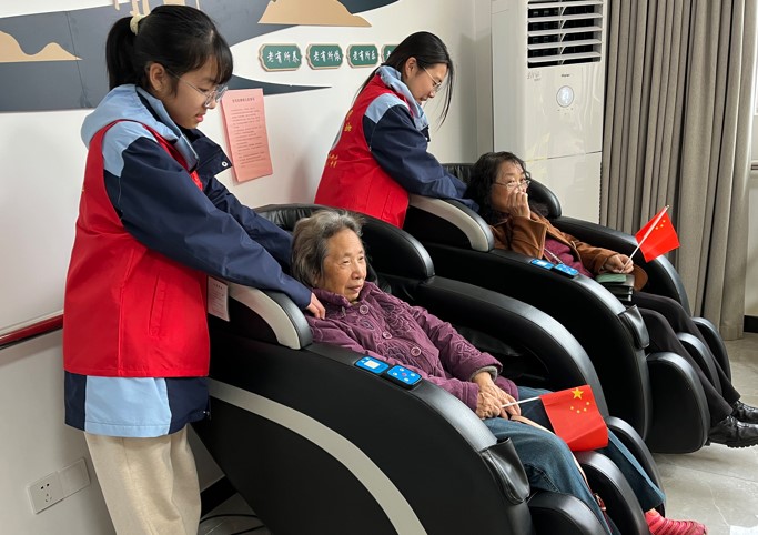 在日间照料中心工作人员的带领下,同学们首先参观社区日间照料中心的生活区、娱乐区,了解了日照中心的基本功能和设施。随后,学生志愿者们按照事先分配的任务各司其职,有的为老人们捏肩捶背,帮助老人们放松身体,有的拿起扫帚、抺布,为老人们打扫房间、床头柜等。有的与老人们一起聊天说笑,讲故事。每一位同学都格外认真与专注。