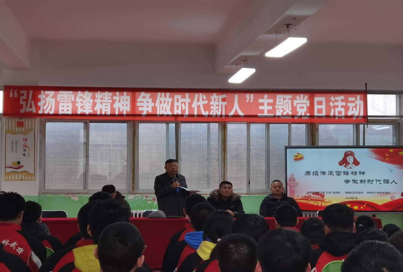 雷锋精神作为中华民族宝贵的精神财富,对于培养学生的品德和社会责任感具有深远意义。为了进一步加强青少年学生思想道德建设,助力学校德育工作的发展,3月4日内蒙古赤峰市松山区向阳街道锦泰社区关工委联合赤峰市少林武术学校开展了"弘扬雷锋精神 争做时代新人"主题党日活动。