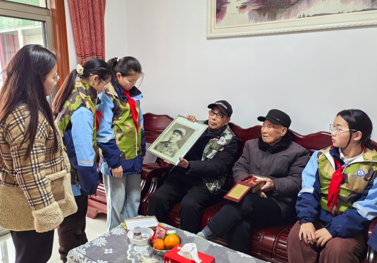 最后,老兵带领青少年走进抗战老兵曹月飞、王国梁家。青少年志愿者们围坐聆听战场故事。王爷爷摩挲着健康包里的“浏河镇退役军人服务站”贴纸,感慨道:“当年我们保家卫国,如今孩子们用志愿服务接力,这‘军魂’永远不灭!”