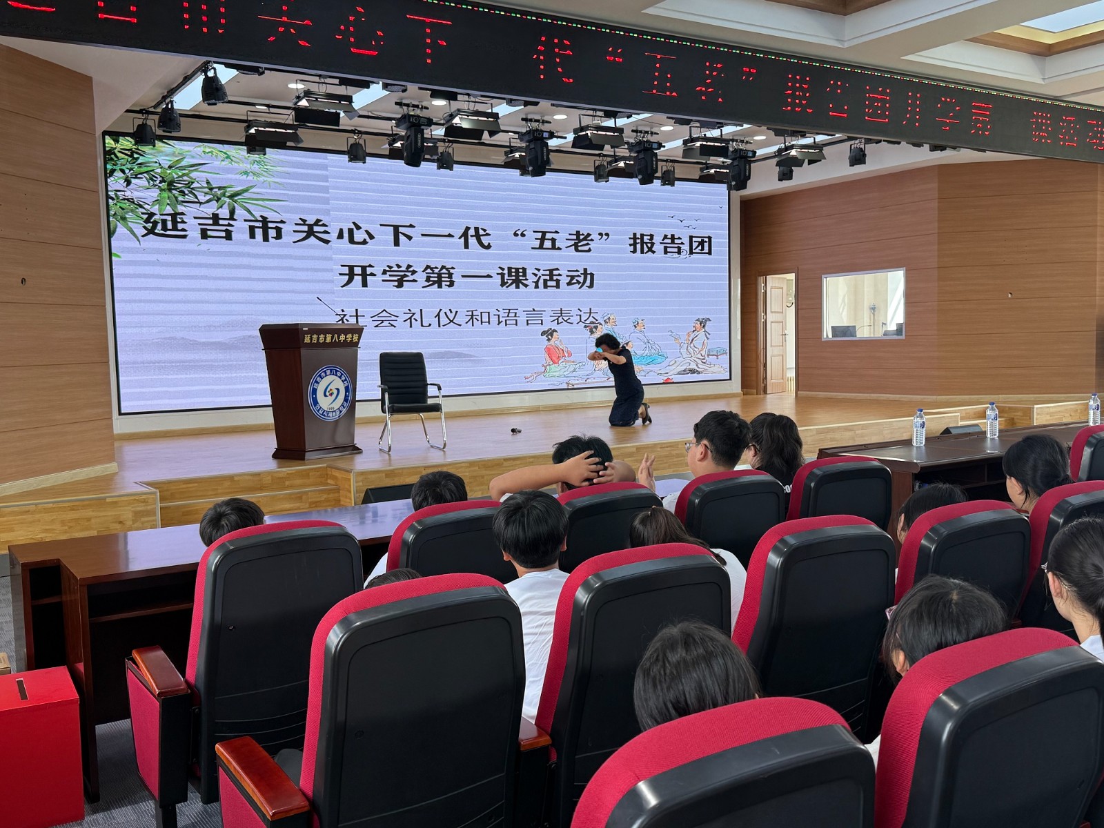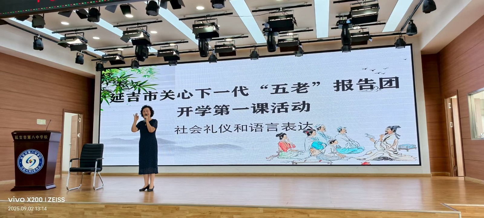 9月2日,传统文化报告团团长李顺子(市文广旅局关工委常务副主任)在市八中作《社会礼仪和语言表达能力》讲座。两所初中累计400余名学生参与;市关工委驻会班子全程参加。