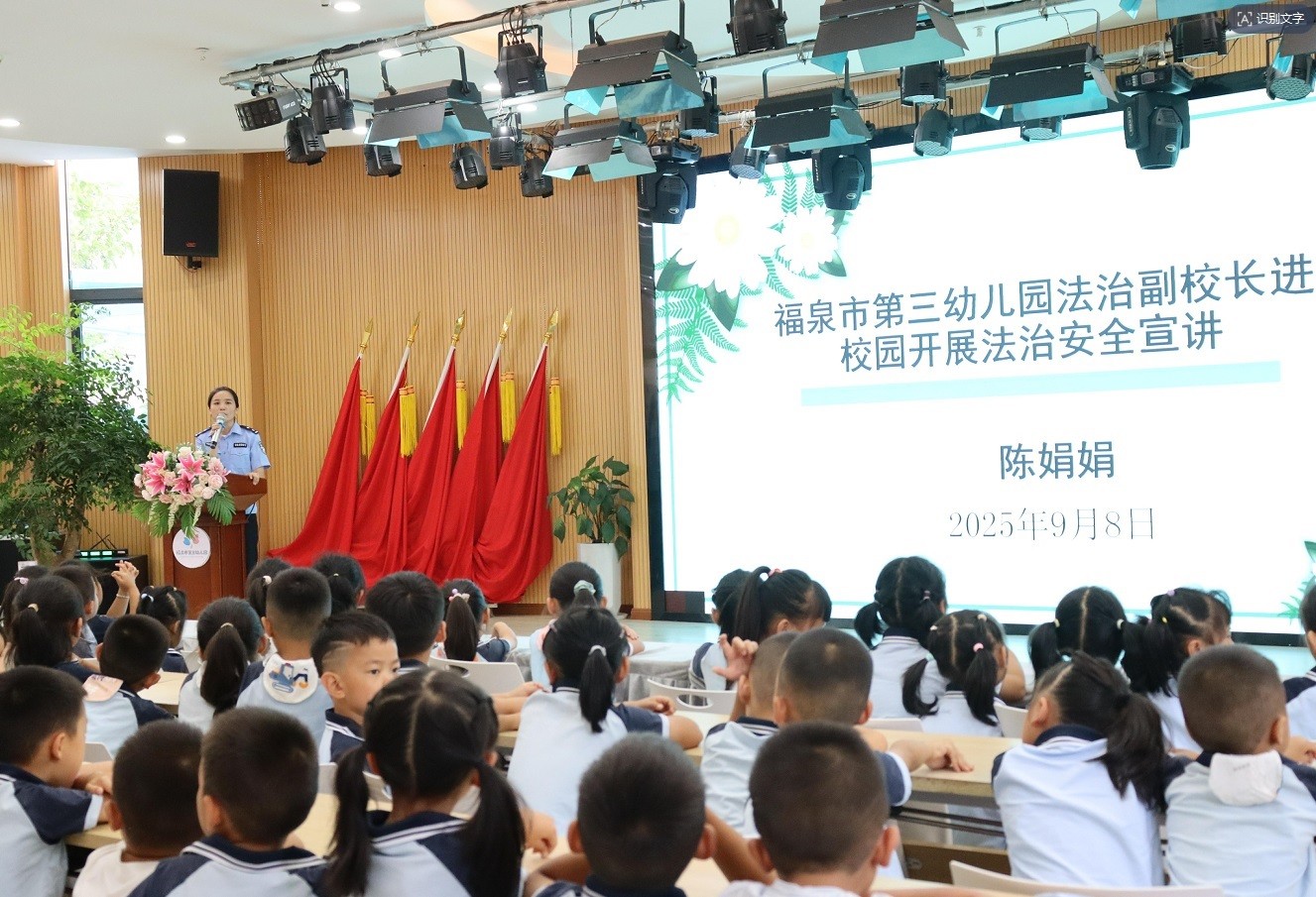 为切实增强师生的安全防护意识,将法治种子播撒在幼儿心田。9月8日,福泉市第三幼儿园关工委邀请福泉市公安局金山派出所法治副校长陈娟娟警官对全体师生开展 “法治安全宣讲”活动。