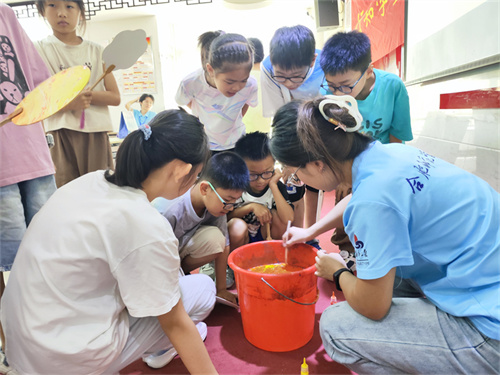 活动伊始,志愿者首先为孩子们生动讲述了教师节的由来与意义,引导大家回忆师恩、感念师情;随后介绍了传统漆艺的历史渊源,并细致讲解了漆扇的制作技巧与注意事项。活动高潮当属非遗水拓画技艺展示。志愿者将特制颜料滴入清水,色彩在水面悄然晕染、交融,化作斑斓纹路;经画针勾划,水面瞬间浮现出如大理石肌理、花朵绽放般的精美图案,变幻莫测如“水中魔法”,引得孩子们阵阵惊呼。随后,孩子们亲手体验制作——他们将素白的团扇轻轻覆于水面,通过精准的提拉动作,将水中绚烂的图案完美转印至扇面。每一把团扇都成为独一无二的艺术品:有的似璀璨星空,有的如秋菊绽放……虽图案各异,却都承载着孩子们对老师最纯粹真挚的祝福。现场笑语不断,孩子们争相展示作品,氛围热烈温馨。