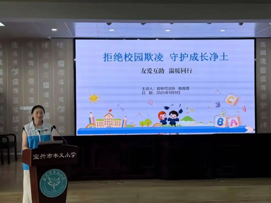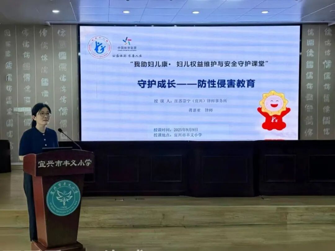 9月9日,宜兴市丰义小学关工委邀请江苏崇宁(宜兴)律师事务所律师和官林司法所工作人员给200多名小学生上了一堂生动的“安全防护课”。 蒋惠亚律师聚焦未成年人防范性侵害热门话题,以“认识身体隐私部位” 为切入点,通过直观图示与通俗讲解,帮助孩子们建立“身体主权”意识,明确“安全接触”与“危险接触”的界限。同时,结合《未成年人保护法》的相关规定,详细分析了校园、家庭、社会等不同场景可能存在的性侵害风险,总结出“警惕识别 — 勇敢拒绝 —及时求助” 防性侵三步法,引导孩子们增强自我保护意识,学会在危险来临时正确采取应对措施,用法律武器守护自身安全。