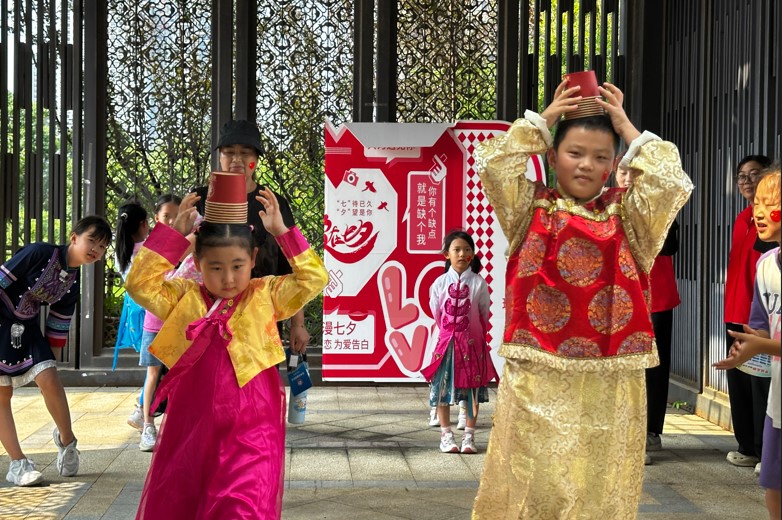 室外“民族风情T台秀”开始了,随着富有民族特色的音乐响起,小模特们身着朝朝鲜族、瑶族、回族、满族等各民族精美服饰,自信满满地走上舞台。他们用稚嫩而认真的步伐,展示了各民族服饰的独特魅力与文化内涵。本次T台秀特别增设了“民族融合”顶碗挑战环节,大家头顶碗稳健地完成行走展示,寓意着各民族文化的交融与传承,需要用心呵护与平衡。