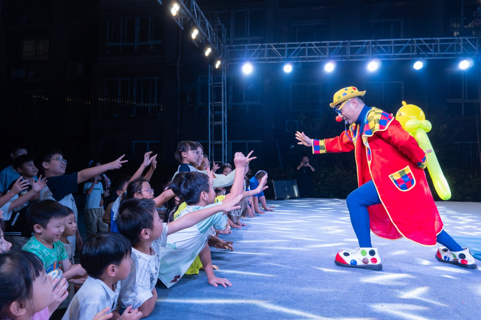 开场舞《吉祥如意》率先登场,瞬间点燃了现场的气氛。舞者们用优美的舞姿和深情的演绎,勾勒出一幅欢腾而美好的画面,让观众沉浸其中。唢呐作为中国各地的传统吹奏乐器,也在本次汇演中大放异彩;柳琴戏经典戏曲《喝面叶》,演员们字正腔圆、韵味十足,赢得了观众的阵阵掌声。音乐表演同样精彩纷呈。歌曲《映山红》、《在此刻》高昂震撼,引发居民跟唱;山东快书表演《好人赞》则以幽默诙谐的方式传递了正能量;杂技表演《力量》和《轮滑》惊险刺激、扣人心弦,赢得观众阵阵喝彩;魔术师带来的表演则在现场掀起一阵小高潮,纸牌和绳子在魔术师手中翻飞变幻,令人目不暇接。除了精彩的节目表演,本次文艺汇演还设置了孩子们最爱的《气球秀》,小丑用气球做成各种动物造型通过石头剪刀布送给现场的孩子,孩子们拿到造型各异的气球,都爱不释手。