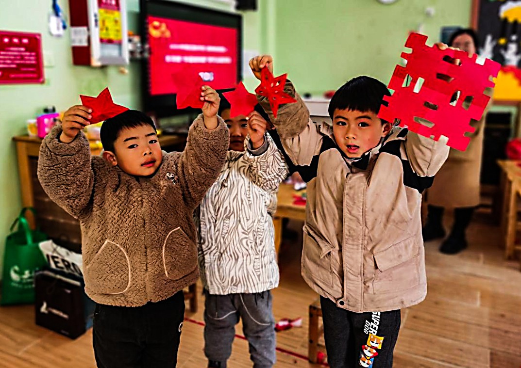 “大家仔细看啊,这样对折再对折,剪刀要倾斜一些剪出来的五角星才好看……”尹修平边讲述边示范,带领着小朋友们共同学习了剪纸星星的制作方法。孩子们纷纷围拢在先生身边,带着稚气却不失认真地问询着剪纸的技巧。不一会儿,一个个形态各异的“闪闪红星”便出现在孩子们的手中,现场充满了喜悦欢乐的气氛。