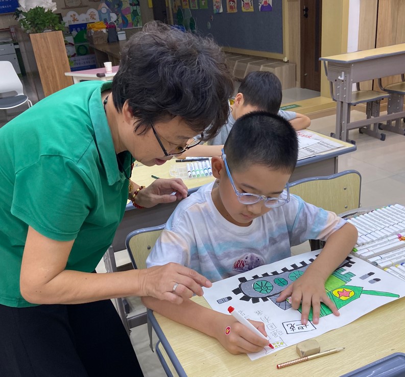 绘画环节中,孩子们踊跃选择自己感兴趣的科技军事装备作为创作对象,在赵老师的指导下仔细观察图片细节,用心描绘大国重器的造型特征与色彩搭配。一幅幅充满童真却又不失严谨的先进导弹、坦克、飞机、机器狗等绘画作品,展现了孩子们对国防科技的理解与想象。