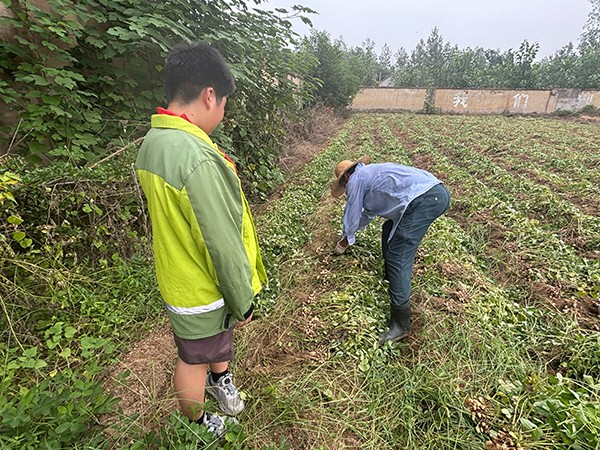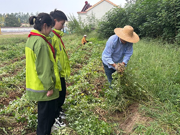 学校邀请有着四十余年种植经验的老农,早早来到花生地边,给孩子们传授拔花生的技艺。