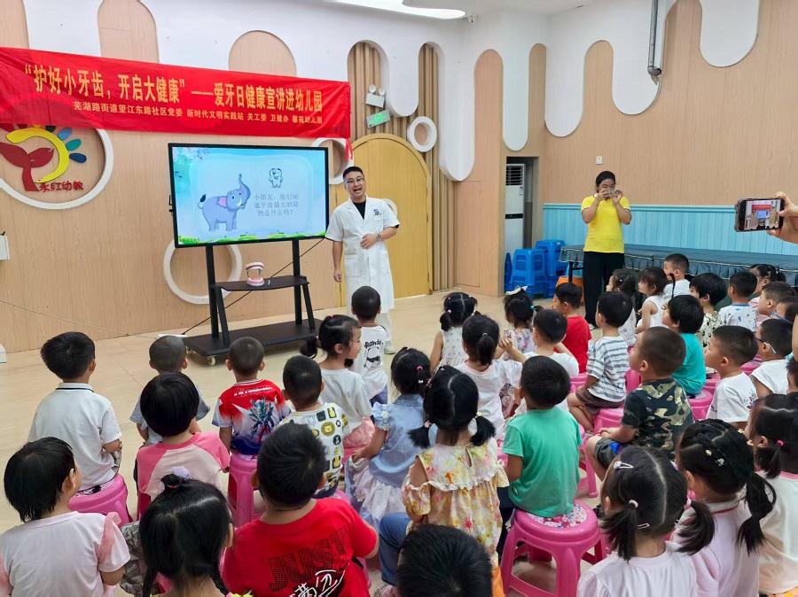 9月16日上午,芜湖路街道望江东路社区党委联合新时代文明实践站、关工委、妇联、工会,携手嘉淮口腔专业机构,共同走进馨苑幼儿园,开展了一场别开生面的“护好小牙齿,开启大健康”爱牙日健康宣讲活动。通过寓教于乐的方式,在孩子们心中播下口腔健康的种子。