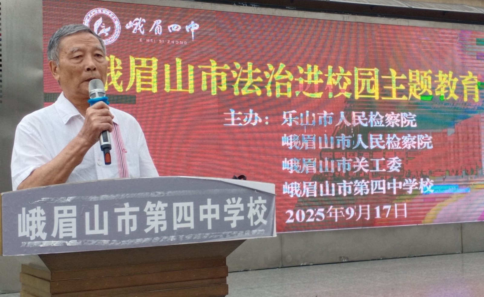 9月17日,在峨眉四中宣讲法律知识中,市关工委常务副主任周秀庚向同学们讲解法治教育的重要性,并希望同学们学法用法,争做德才兼备的好学生;接着,市检察院宣讲员杨舒婷讲解了《法治守护青春、少年向阳而行》,全校2200多名初中学生在运动场上整整齐齐就坐听讲,杨舒婷用现实案例生动讲述“反对校园霸凌”。