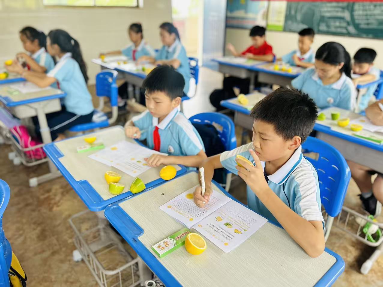 活动伊始,老师给学生们分发了实验材料,包括柠檬、铜片、锌片、导线、棉签和LED灯。同学们分别对不同品种的柠檬从颜色、果皮厚度、果汁含量、香气特点等方面进行观察填写记录手册,完成关于柠檬的初认识。随后向学生们介绍了水果电池的原理:利用水果中的酸性物质与金属电极发生化学反应,产生电流。