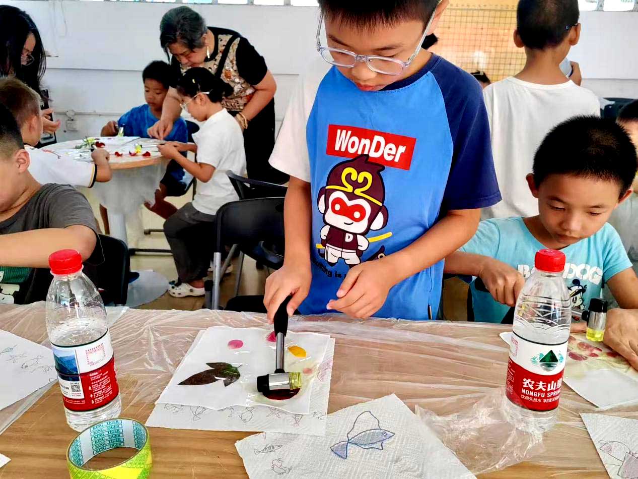 活动伊始,老师通过图文讲解与实物展示,为孩子们揭开植物拓染的神秘面纱。从这项技艺在古代服饰、家居装饰中的传统用途,到其“以自然为墨、以织物为纸”的文化内涵,通俗的讲解让孩子们直观感知到非遗技艺与自然的紧密联结,也为后续实践筑牢兴趣基础。