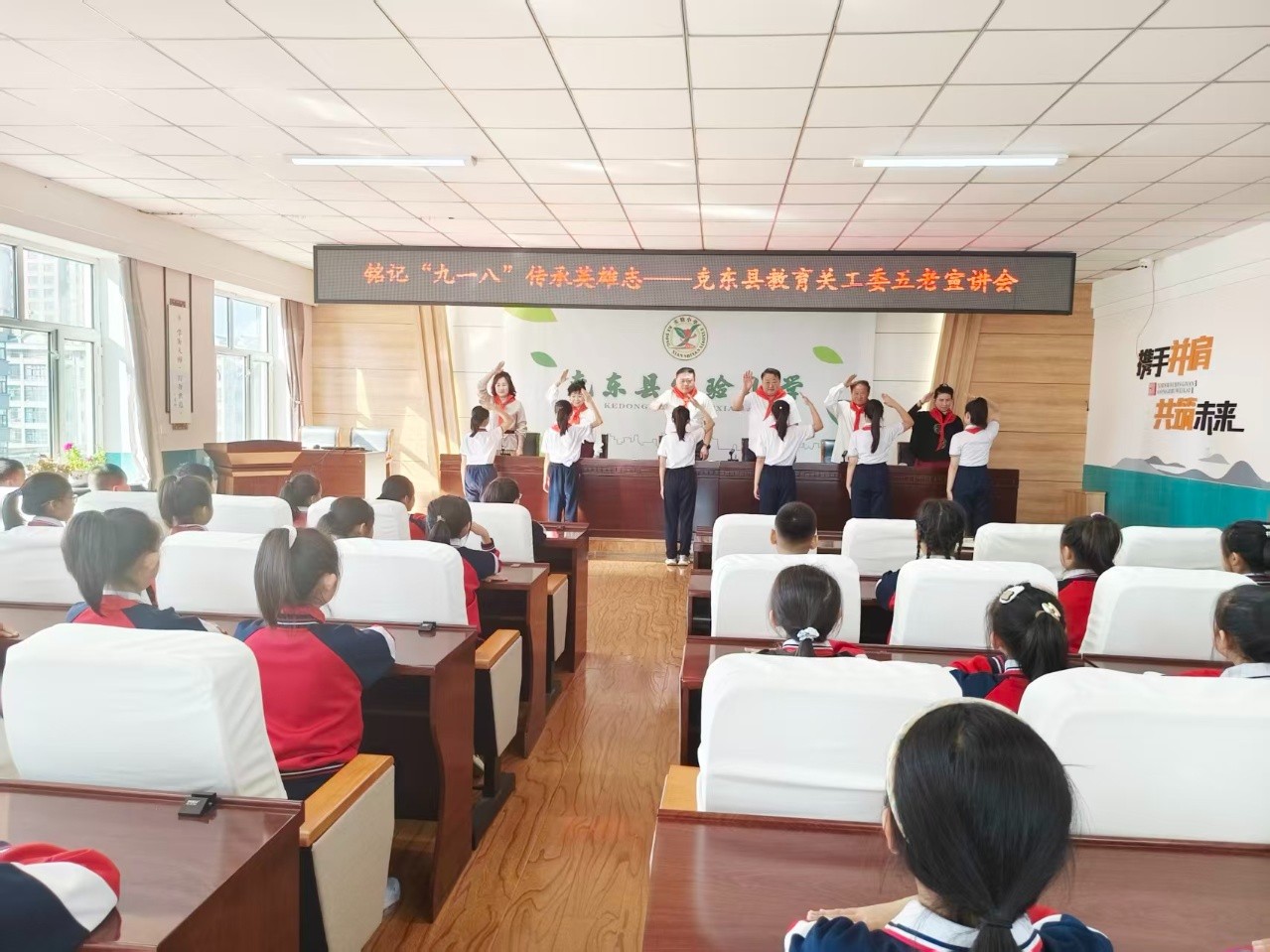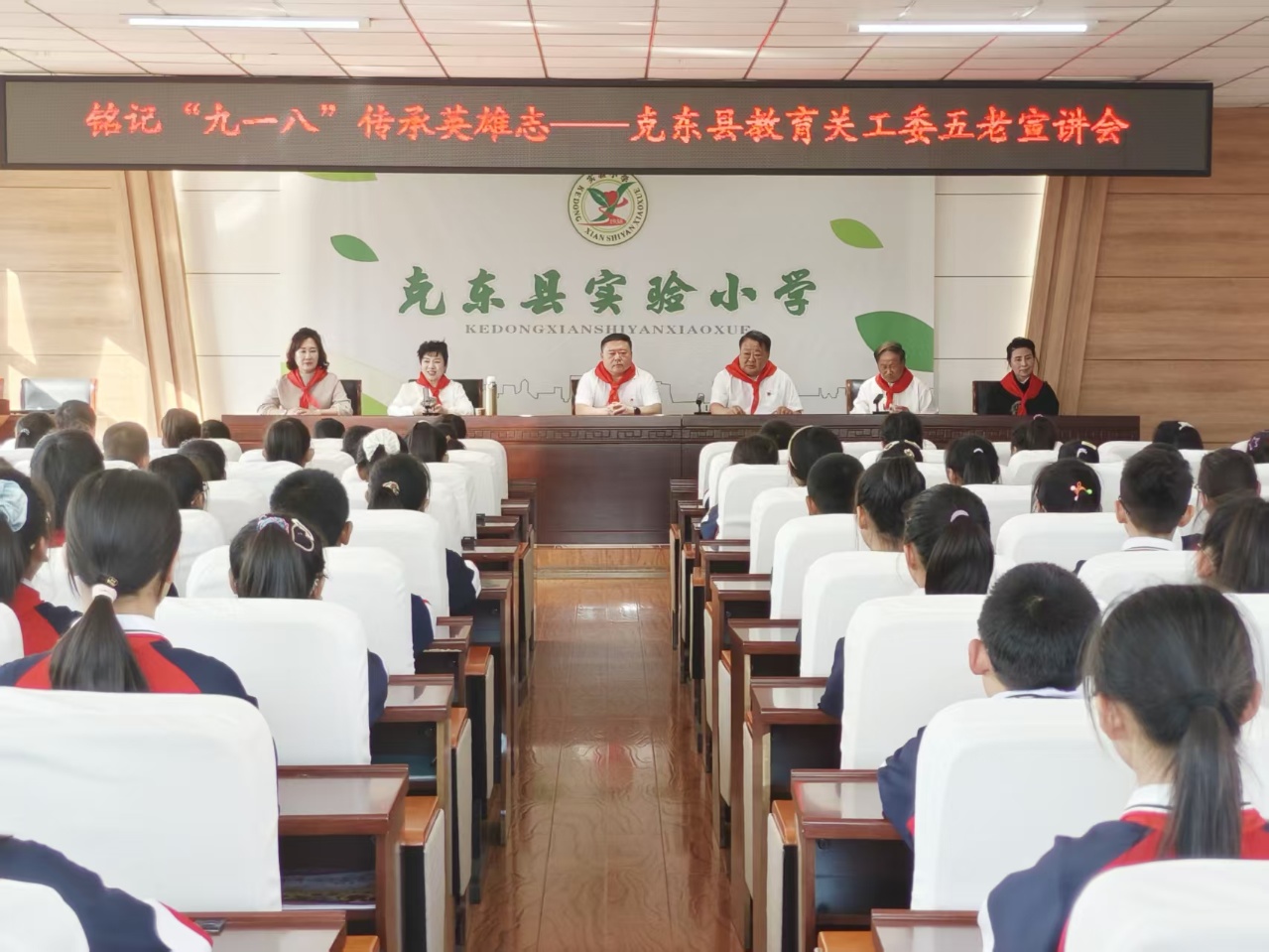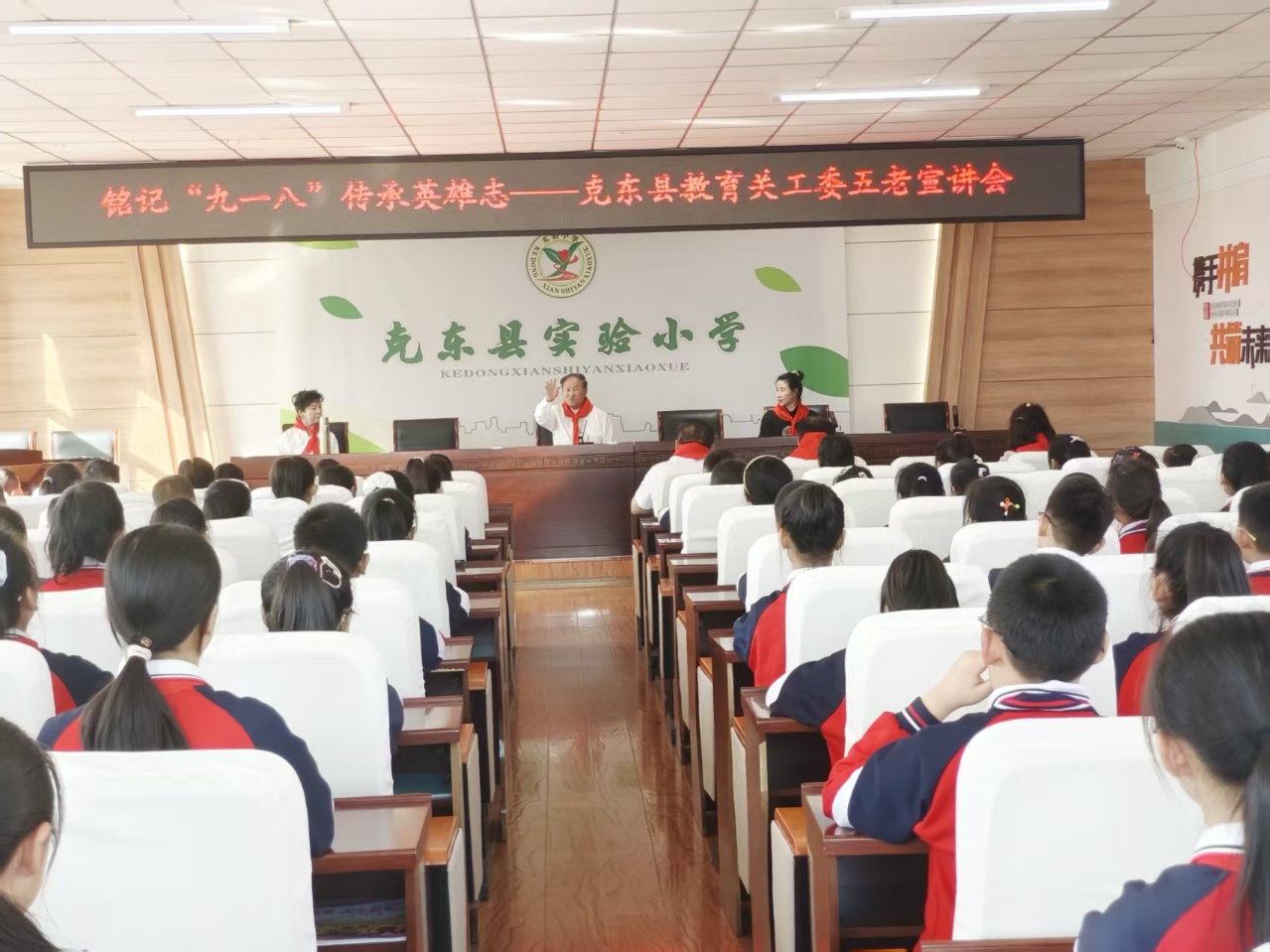 铭记历史,以史为鉴,振兴中华。黑龙江省齐齐哈尔市克东县教育关工委银龄“五老”宣讲团9月19日下午,深入到克东县实验小学为少先队员们宣讲抗战英雄故事,受到学校领导和少先队员们的热烈欢迎。实验小学的主要领导参加了宣讲会。6名少先队员为宣讲团的老师们配戴了鲜红的红领巾,红色故事宣讲在凝重的气氛中进行。