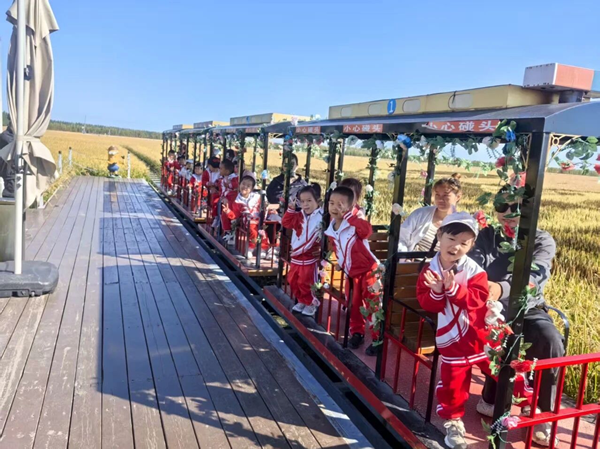 小班组的孩子们化身“小小农学家”,乘坐色彩鲜艳的观光小火车穿梭于北大荒稻田。老师沿途讲解水稻生长过程与北大荒的农耕文化。孩子们看着饱满的稻穗,听着“粮食来之不易”的故事,亲身感受着丰收的喜悦,稚嫩的脸上满是对家乡土地的热爱。