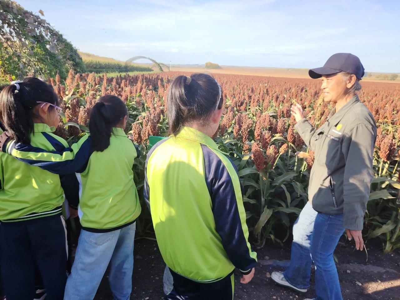 踏入农场农业科技园区,同学们首先来到大豆种植区,这里的大豆在科学的栽培管理下茁壮生长。大西江学校校外科研副校长、省级劳模、“五老”温淑霞详细介绍了大豆的新品种的培育和推广。接着,同学们来到高粱种植区,“五老”温淑霞又为同学们讲解了高粱从播种到收获的全过程,以及如何通过科学种植提高高粱的产量和品质。同学们好奇地观察着高粱的形态,提出各种有趣的问题,现场气氛十分活跃。在玉米种植区,一排排整齐的玉米植株吸引了同学们的目光。农技专家廖永霞介绍了玉米采用无人机进行病虫害监测、利用卫星遥感技术监测土壤墒情等技术。这些先进的农业科技让同学们大开眼界,也让他们认识到农业不再是传统印象中的“面朝黄土背朝天”,而是充满科技含量的现代化大农业。此次研学活动,让同学们学到了丰富的农业科技知识、产生了建设现代化大农业的浓厚兴趣。
