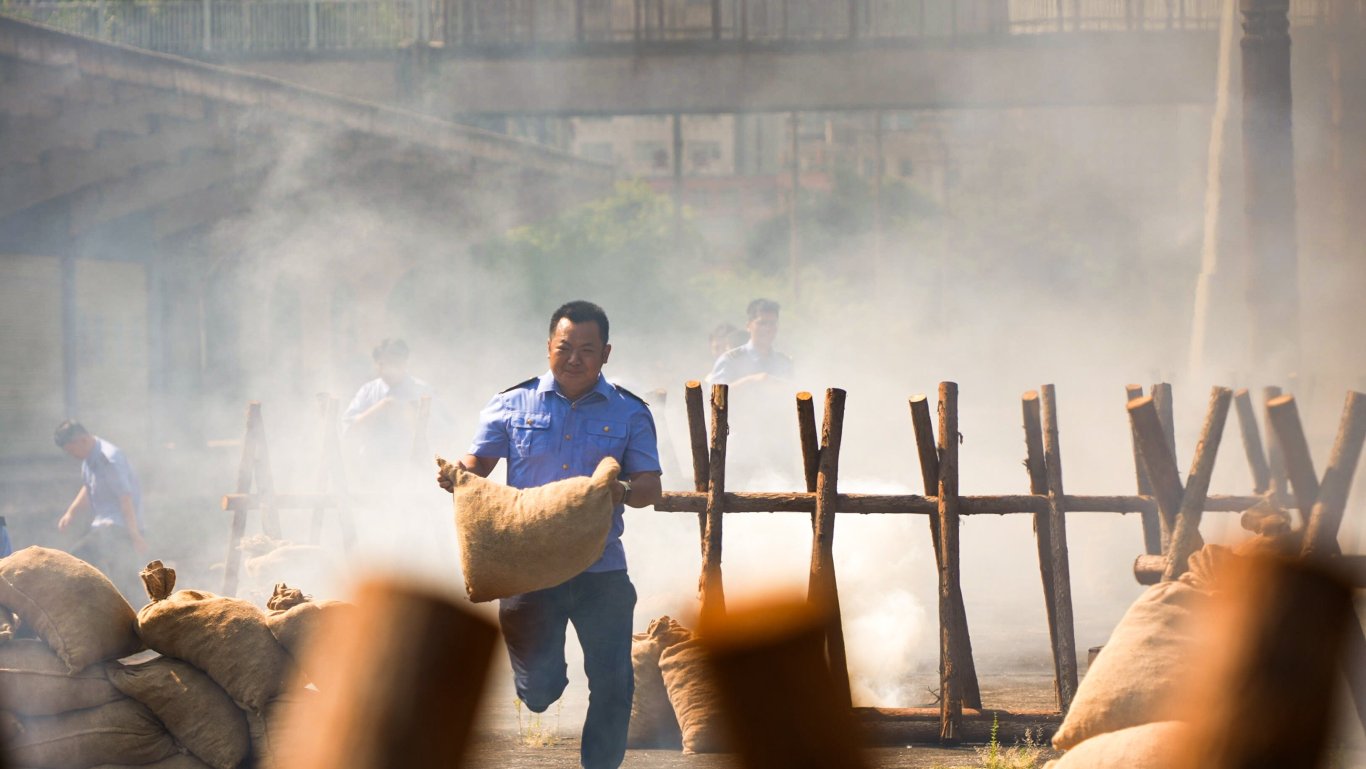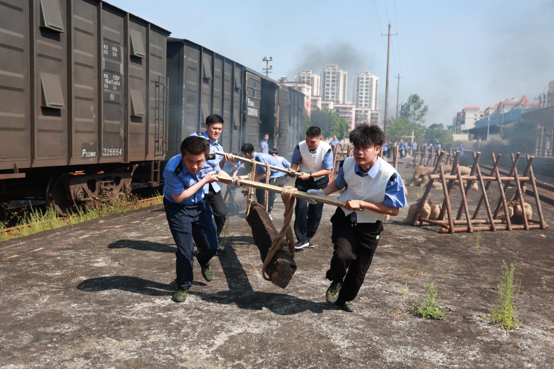 素质拓展环节备受关注,大家纷纷走到站台边缘观摩。“有炸弹,快趴下……”现场烽烟滚滚,两辆黑旧的篷车停在股道,木栅栏蛇形摆开,实景再现了1944年日军用飞机轰炸柳州铁桥和工人们运送物资抢修铁路的场景。青年们分组化身“抢修队”“转运队”,用扁担、麻绳运送枕木、抢运麻布袋。期间,模拟的飞机轰炸声和防控警报声此起彼伏,大家听到警报立即下蹲躲避,“牺牲”的队员则由后补队员接替,青年们全身心投入,展现出奋勇拼搏、不怕牺牲、前赴后继、英勇无畏的战斗场景。最后,在《歌唱祖国》的大合唱中,活动落下帷幕。