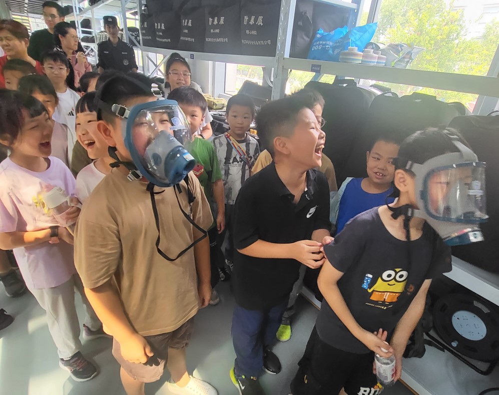 随后,霸气的特警防暴车、功能齐全的警务移动方舱等特种车辆依次亮相,瞬间点燃了孩子们的热情。警务人员详细介绍了车辆的实战功能,孩子们围着车辆兴奋地提问,在一问一答中,对公安干警守护平安的 “硬核力量” 有了直观认知。