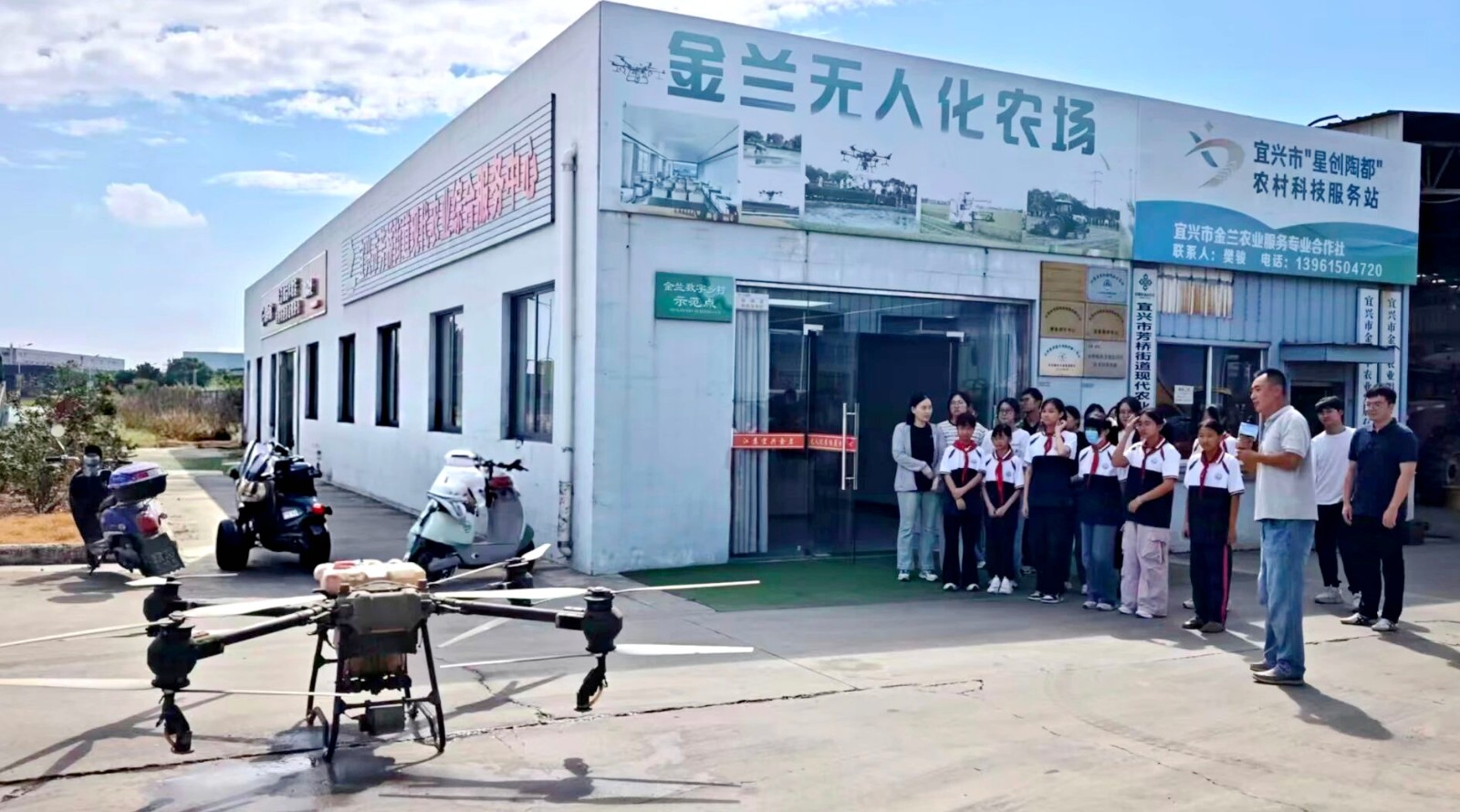 随后,参与者开启现代农业探索之旅。在稻米科普文化馆,大家了解了金兰村稻米产业的发展变迁;在农机站,技术人员讲解现代化设备的原理与应用;田间地头,农技人员操控无人机作业,培源中学的学生代表还以“金色稻田”为主题进行创作,记录乡村美景与科技的融合。