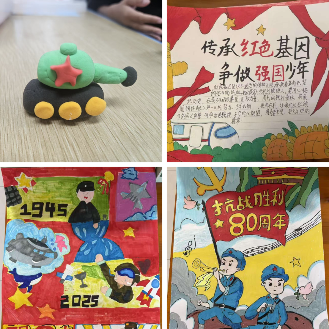 该校开展“铭记抗战历史 传承红色基因 争做时代新人”主题征文、绘画、书法、手工艺制作等活动。队员们以笔为媒、以艺传情,用文字书写对历史的铭记、对先烈的崇敬,用画用画笔、笔墨和手工创作表达对和平的珍爱,每一件作品都是爱国情怀的生动抒发。