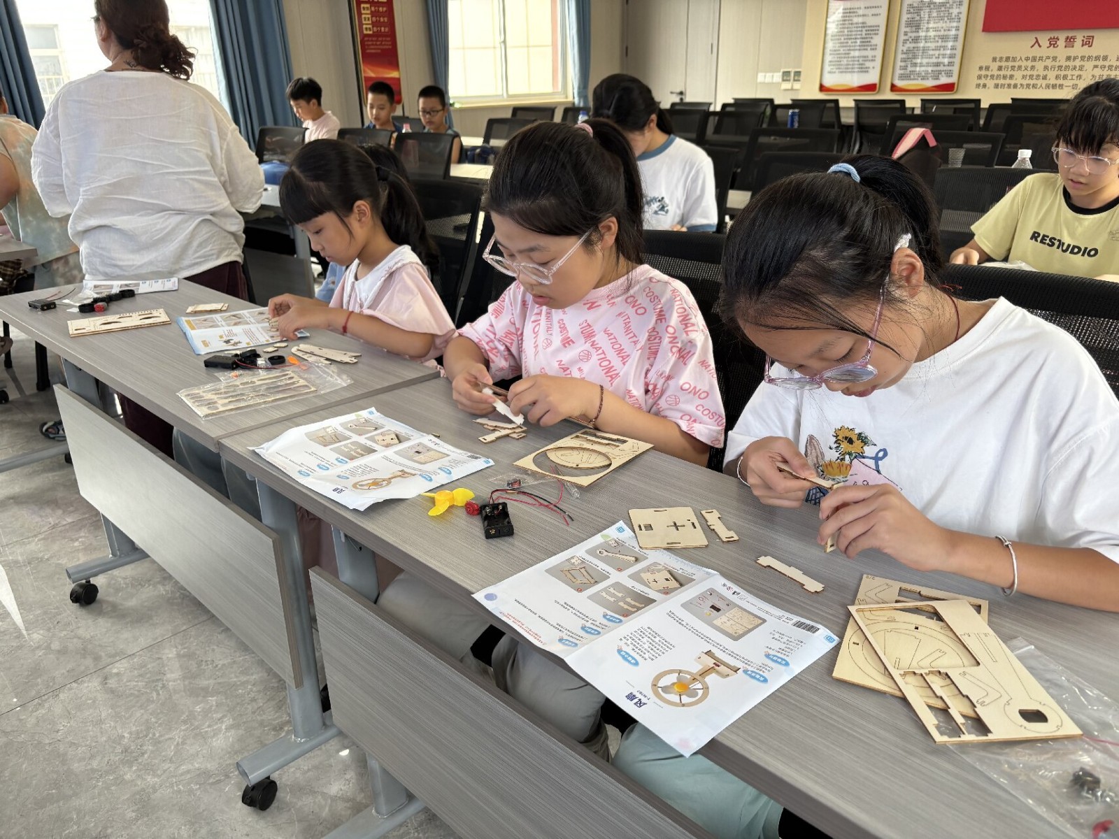 提升素养增强能力。校外辅导站注重孩子自理能力、动手能力培养。“暑期安心托班”按照牙防所设计的粉蓝双色打卡表,孩子们自觉开展“21天刷牙打卡”健康行动,由家长每日拍照上传小程序给社区,完成率达96%。组织孩子们开展以“海陆空先锋”为主题,木工小创客展手艺活动在关工委“五老”分步示范指导下,孩子们化身木工小创客,螺丝刀当“转向盘”,锉刀作“雕刻刀”,打磨、上胶、装轴……一丝不苟,经过一小时的精心制作,12 辆木质吉普车列队待发,7架滑翔机振翅欲飞,11艘轮船“鸣笛”启航。孩子们的综合素养得到有效提升,安全知识知晓率提升35%、传统文化兴趣指数提升40%。