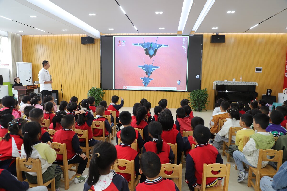 宣讲中,张佳亮同志以幼儿易于理解的语言,生动讲述了全民国防教育日的由来与重要意义,并结合历史脉络,通俗阐释了国家从“站起来”“富起来”到“强起来”的发展历程。并借助图文并茂的PPT和动画视频,直观呈现陆军、空军、海军、火箭军的飒爽军容与先进武器装备。同时,详细介绍了军事航天部队、网络空间部队、信息支援部队、联勤保障部队等特色兵种的职能特点。孩子们被军人英姿与高端武器深深吸引,现场不时响起惊叹声,眼中满是对国防力量的好奇与崇敬。