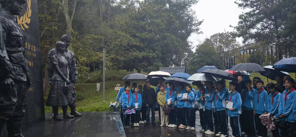 冒着纷纷细雨,市、区关工委老同志与青少年学生一起瞻仰英雄纪念雕塑,缅怀那段战火硝烟、攻坚克难、百折不挠、血战到底的光辉历史。