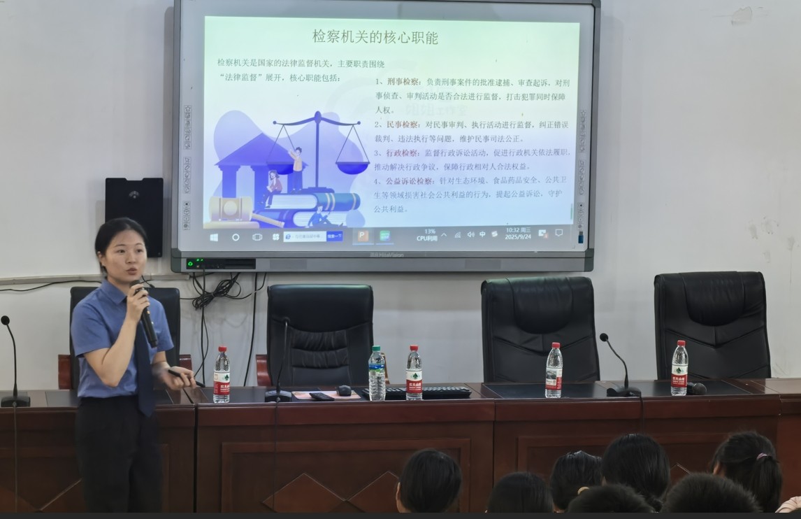 随后,刘莹姐姐工作室成员黄婕为同学们深入介绍了检察机关的核心职能。从刑事检察如何打击犯罪、保障人权,到民事检察、行政检察对维护司法公正和保障公民合法权益的作用,再到公益诉讼检察守护公共利益的重要意义,同学们对检察机关的工作有了更为全面和深刻的认识,也明白了法律监督在社会生活中的重要性 。