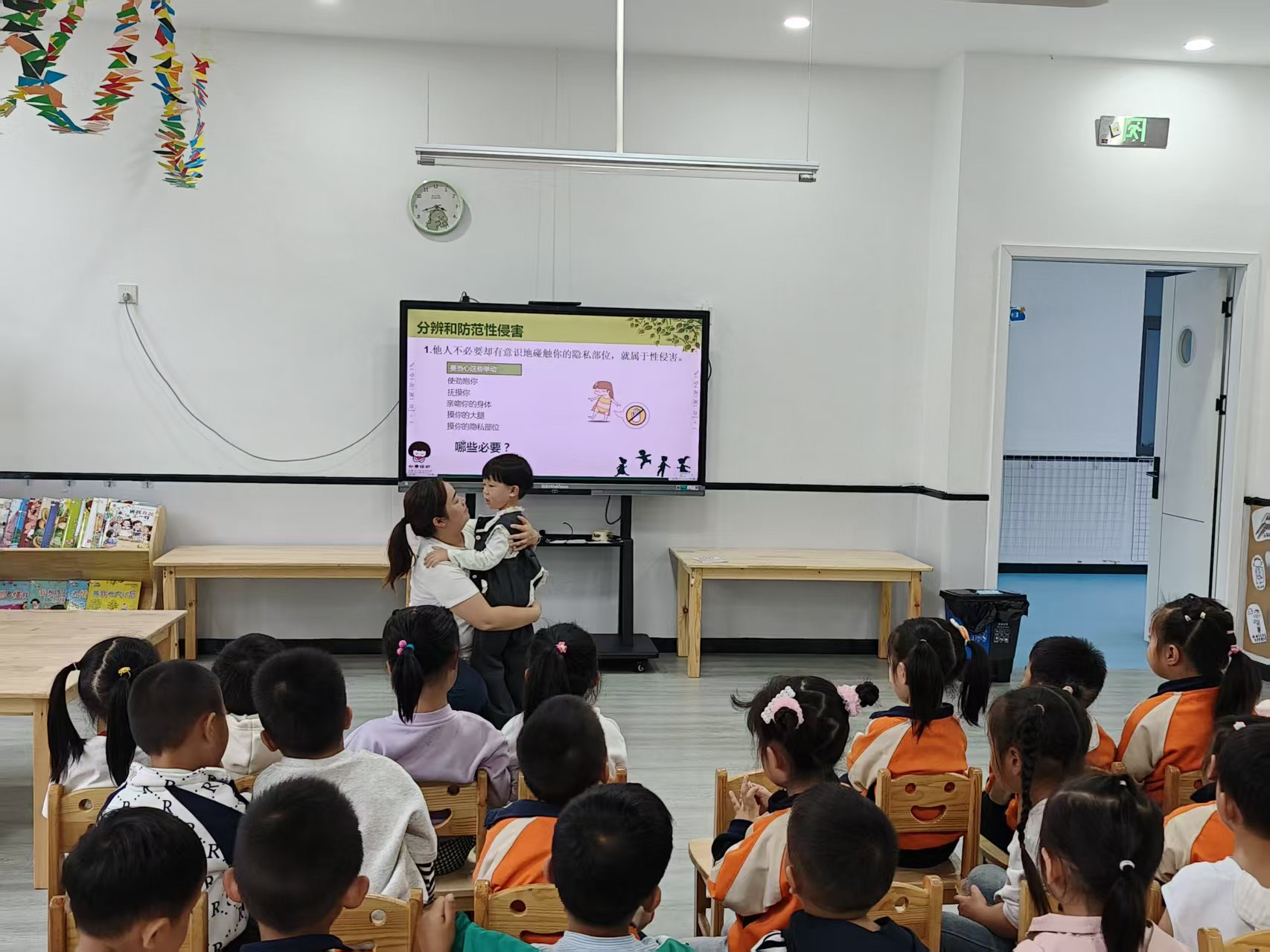 老师们主要从“好朋友应该是什么样的”、“认识我们的身体”、“分辨和防范性侵害”、“万一遭遇性侵害后该做什么”等方面进行教学。让孩子们在游戏中认识自己的身体;在互动中知道了哪些是好的触碰,哪些是不好的触碰;在回答问题中明白了对自己身体感觉不安全、奇怪、别扭、不舒服的、不好的触碰,要敢于坚定勇敢大声地说“不”。同时,各班老师还对孩子进行防性侵害辅导(访谈)谈话,进一步加深了幼儿防性侵害安全意识。