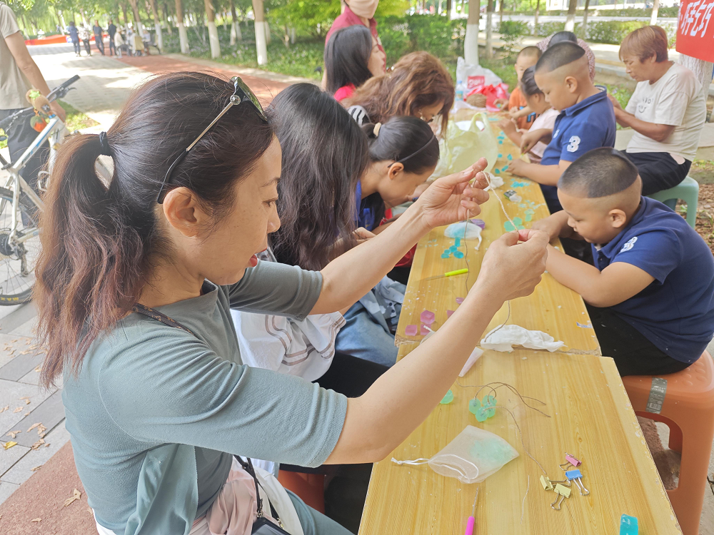 首先,参与者签到,现场领取活动DIY材料包。志愿者现场教学,提供照片和视频以供参考。热闹的亲子游戏区,是笑声与温情的聚集地。孩子们利用麻绳、香皂、锥子、丝带等工具,将香皂分割成宝石一般的颗粒,再将香皂颗粒组装成晶莹剔透的葡萄或水晶串珠车挂,所有的成品无不融入了前来参与的辖区居民的七夕巧思和美好祈愿。