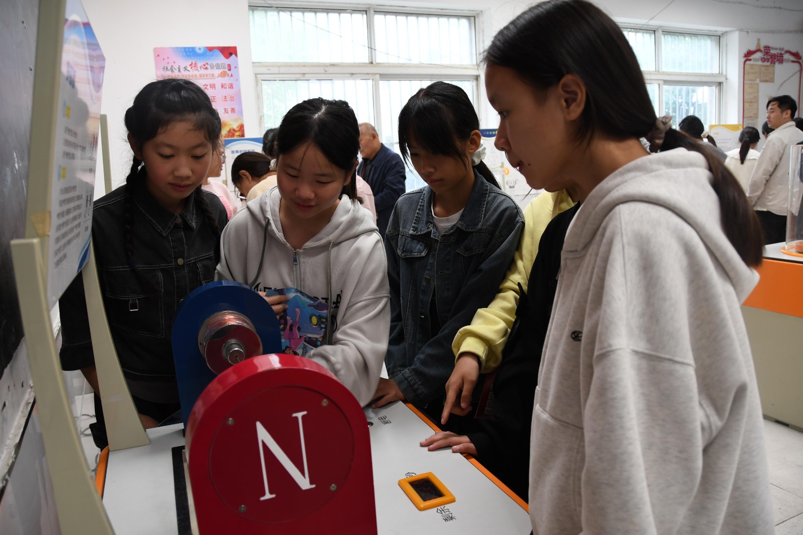 实验互动区陈列着“电磁探秘”“运动旋律”“力学原理”等多样科普展品。同学们通过聆听讲解、现场问答,对科学原理获得了更为直观深刻的理解,并亲手操作实验设备,兴致盎然地探究其中蕴含的科学奥秘,在实践中体悟科技的力量。