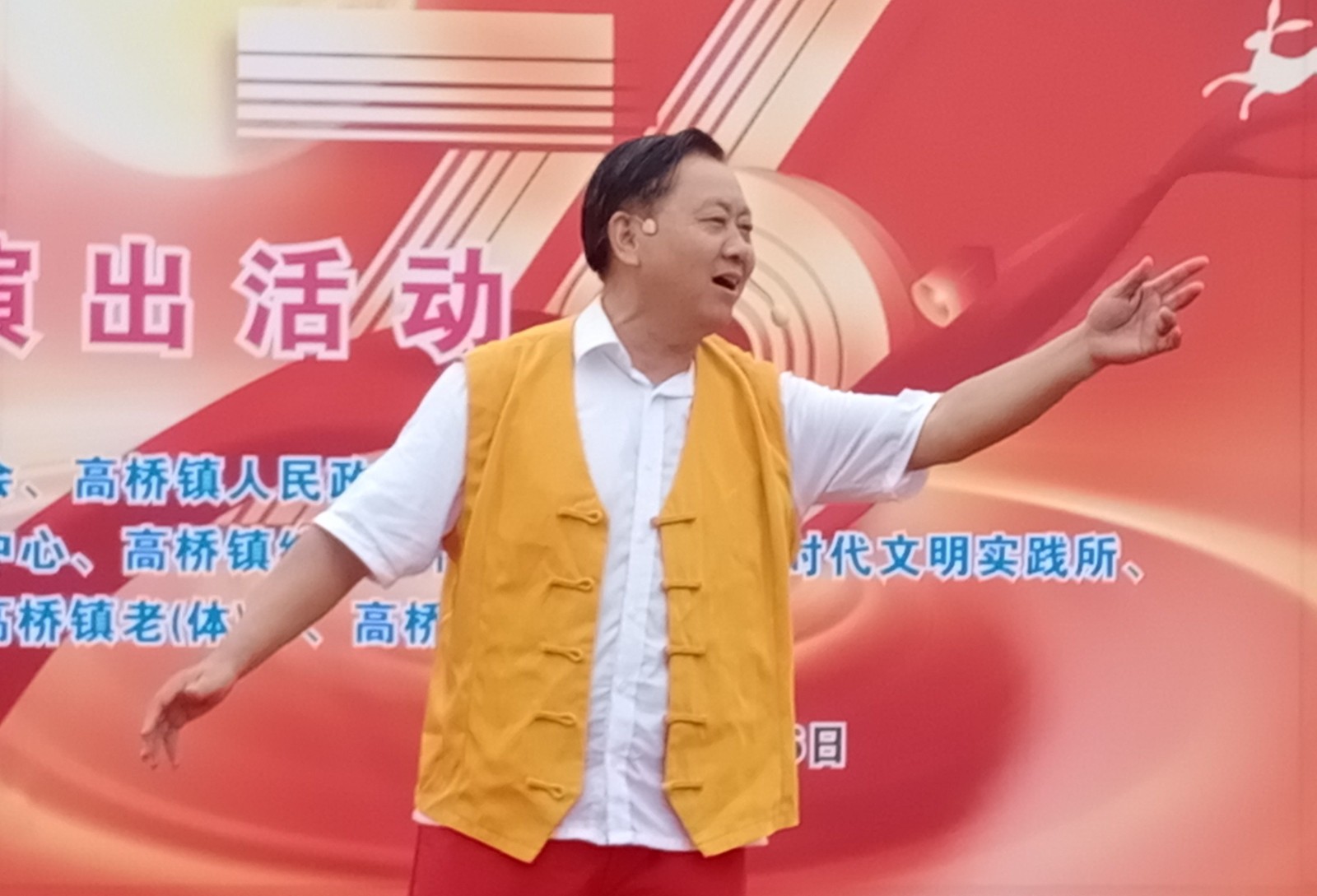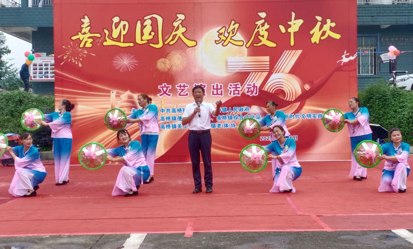 演出在高桥镇文化站广场上举行,参加文艺演出的单位分别有高桥镇老年人学校、高桥镇小学校、高桥镇各村、社区和峨眉山歌传承人员、镇关工委副主任、镇老年人体育协会副主席、镇老年人协会副会长张榜云、官云华等近百人出演。