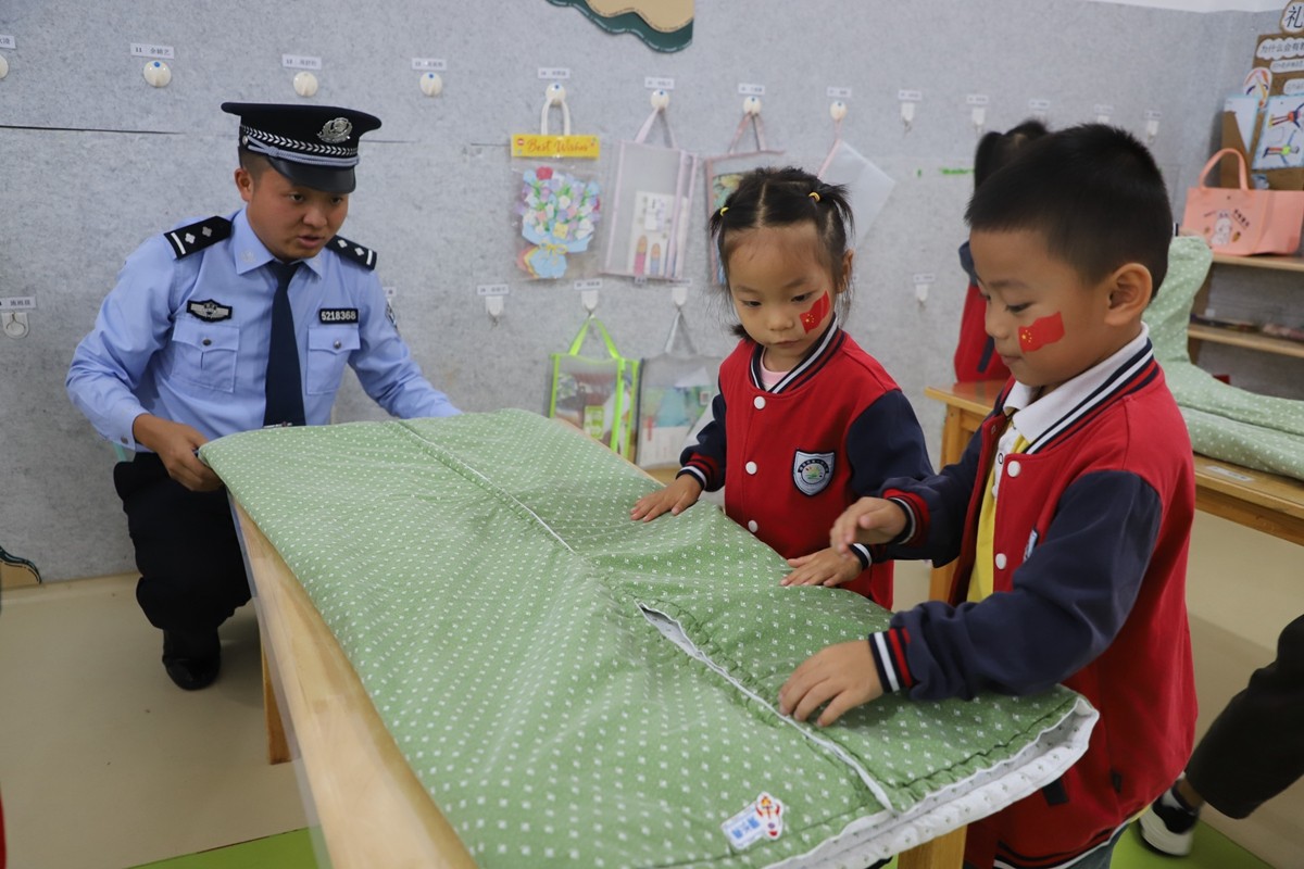 升旗仪式结束后,特警队员们现场展示了稍息立正、跨立立正、蹲下起立等基本队列动作,还指导孩子们学习正确坐姿、站姿,以及叠被子、折衣服等内务整理技能。幼儿们认真聆听、仔细模仿,操作得有板有眼,在实践中感受军人的严谨作风。