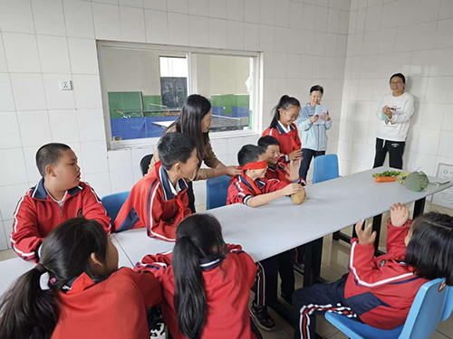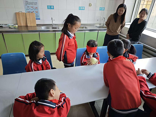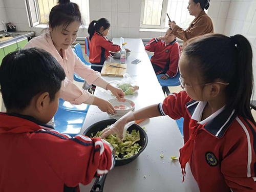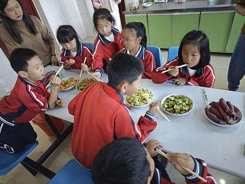 随后,学生们利用蒙眼猜蔬菜的道具蔬菜制作安全、易操作的家常菜。凉拌黄瓜、凉拌卷心菜、凉拌西蓝花、炒土豆丝、鸡蛋炒西红柿每道菜都是学生们亲手完成的。再配合同学们经过一夏天的等待收获的地瓜,可谓简单又丰盛,减负更增效。