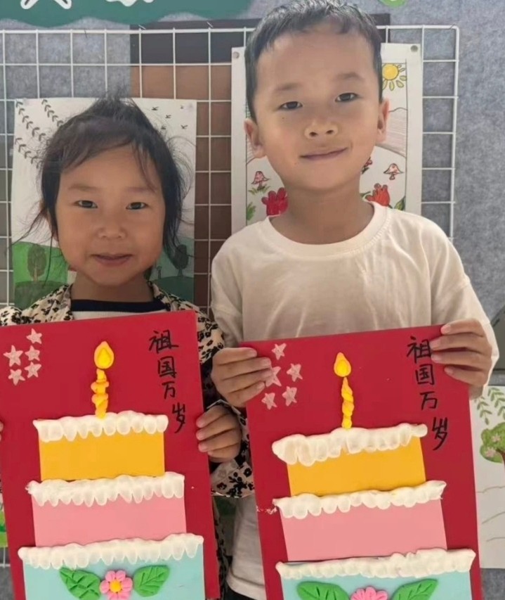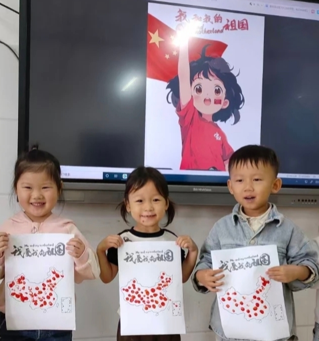 在主题班会上,老师们通过生动有趣的故事讲解、图片展示和视频播放,向孩子们介绍了国庆节的由来和意义,让他们了解祖国的历史和文化,感受祖国的繁荣与强大。各班根据孩子的年龄特点,开展了丰富多彩的手工制作活动:小班的孩子们用稚嫩的小手,通过手指点画的方式,在“我爱我的祖国”主题画上留下了对祖国最真挚的祝福。中班的孩子们则发挥自己的想象力和创造力,利用彩泥等材料,制作出了精美的地图拼图和中国国旗。大班的孩子们更是别出心裁,他们用彩泥制作出了象征祖国繁荣昌盛的生日蛋糕。孩子们还亲手在蛋糕上插上了点燃的蜡烛,共同为祖国母亲唱响了生日赞歌。孩子们或朗诵诗歌,或演唱爱国歌曲,或讲述英雄故事,用稚嫩的声音传递着对祖国的无限敬仰和深深眷恋。
