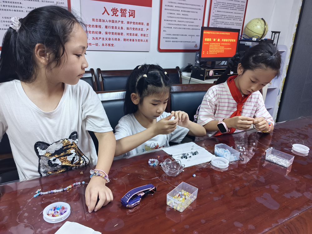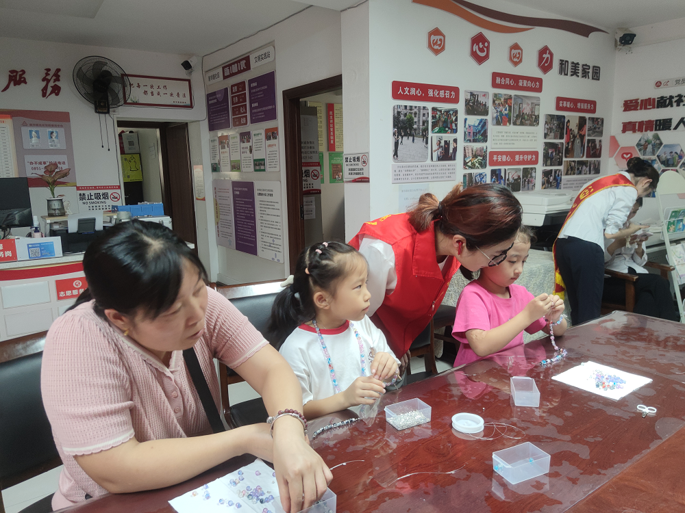 活动伊始,志愿者提前准备好串珠、鱼线等手工材料及相关工具,并循环播放制作教学视频。视频中精美手工艺品的制作过程充分展现了传统技艺的魅力,引得居民连连称赞。在手工制作环节,家长与孩子默契协作:妈妈们熟练地引领制作,孩子们认真协助挑选材料、传递配件,亲子之间在互动中增进了情感交流。现场笑语不断,暖意融融,充分体现了“大手拉小手”的良好氛围。