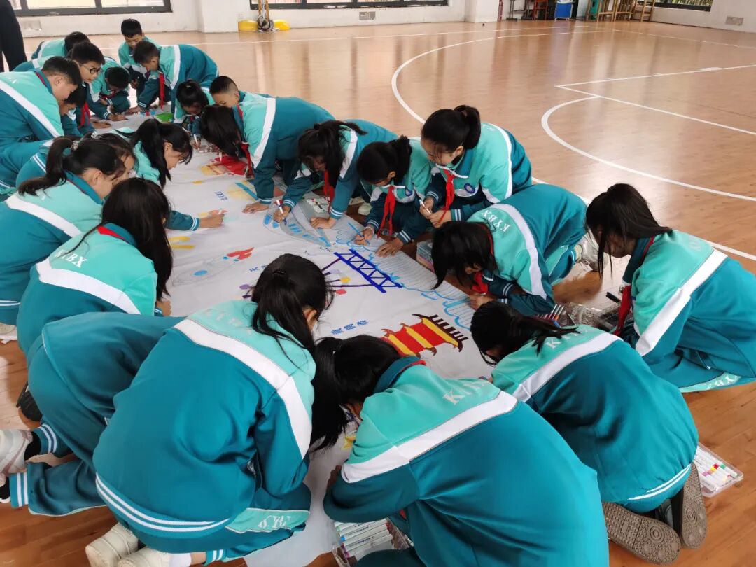 在学校风雨馆,一场以“我心中的祖国”为主题的大型集体绘画活动在此展开。孩子们俯身于长卷之上,红色的旗帜、金色的城楼、蓝色的航天器……他们用画笔自由挥洒,欢声笑语不断。当画卷完成,全体师生环绕着这幅充满童真与想象的巨作,再次齐声高唱《我和我的祖国》,深情的歌声将现场气氛推向顶点。
