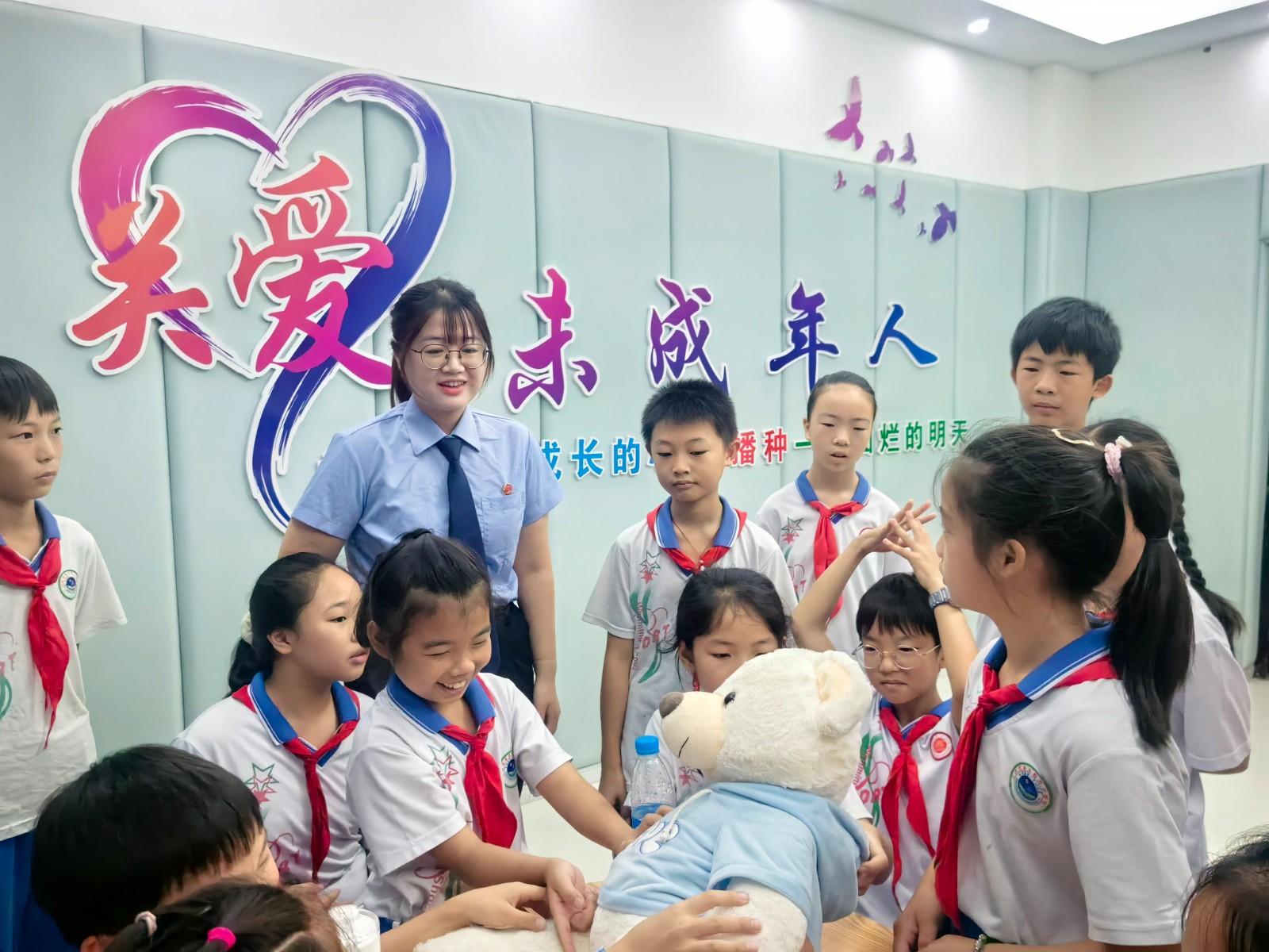 走进未成年人被害人一站式办案救助中心,柔和的灯光、温馨的装饰让队员们放慢脚步。检察干警轻声讲述:“这里是‘受伤小天使’的‘避风港’,我们用专业和温情,帮他们走出阴霾……”听着讲解,五(13)中队少先队员廖俪茜轻轻摸了摸桌子上的小熊玩偶:“以前觉得检察院很严肃,没想到这里藏着这么多温柔的守护。”队员们围坐讨论,懂得了“避免二次伤害”的法治智慧,更感受到法律对未成年人的特殊呵护。