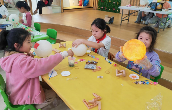 随后,孩子们化身为小小艺术家,创作属于自己的独一无二的月球灯。他们有的参照示例图,小心翼翼地勾勒出玉兔、桂花树等经典图案;有的则大胆创新,将鲜艳的国旗、绚烂的烟花与月亮元素巧妙结合,表达对祖国的热爱与祝福;还有的精心设计明暗渐变,力求还原月球的真实纹理,充满探索精神……