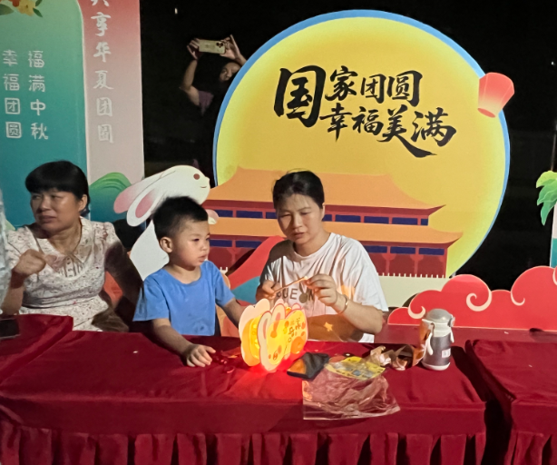 温馨花园活动现场,精心布置的红色灯笼与中秋元素交相辉映,鲜艳的五星红旗随风飘扬,处处洋溢着喜庆祥和的节日气息。在最受居民欢迎的“巧手做花灯”区域,社区工作人员和关工志愿者提前备花灯等材料,家长带着孩子围坐一桌在旁耐心指导,亲子间的互动温馨十足,不一会儿,普通的材料就变成造型漂亮的花灯。